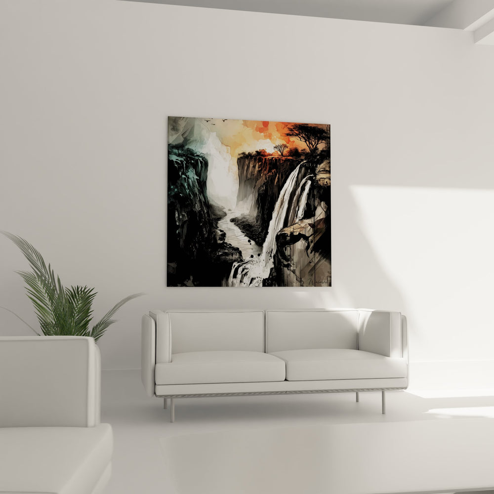 Ce tableau mural cascade présente une représentation saisissante de chutes d'eau majestueuses dans un style artistique contemporain mêlant réalisme et abstraction. L'œuvre dépeint un paysage rocheux spectaculaire où plusieurs cascades s'écoulent à travers des falaises imposantes. La composition révèle un canyon profond aux parois verticales, créant un contraste dramatique entre les masses rocheuses sombres et les chutes d'eau blanches qui s'élancent vers le vide. L'artiste a magistralement capturé la puissance et la fluidité de l'eau en mouvement, utilisant des traits expressifs et des couleurs contrastées. Les cascades naturelles sont représentées avec un réalisme saisissant, tandis que le ciel embrasé d'orange et de rouge apporte une dimension mystique à l'ensemble. La végétation clairsemée sur les plateaux rocheux, notamment les arbres aux silhouettes caractéristiques d'Afrique, évoque les grands espaces sauvages. Cette décoration murale cascade transforme instantanément l'atmosphère d'un intérieur, apportant la majesté des forces naturelles dans votre espace de vie. Le traitement artistique unique de ce tableau cascade moderne en fait une pièce décorative exceptionnelle qui captive le regard et inspire la contemplation.