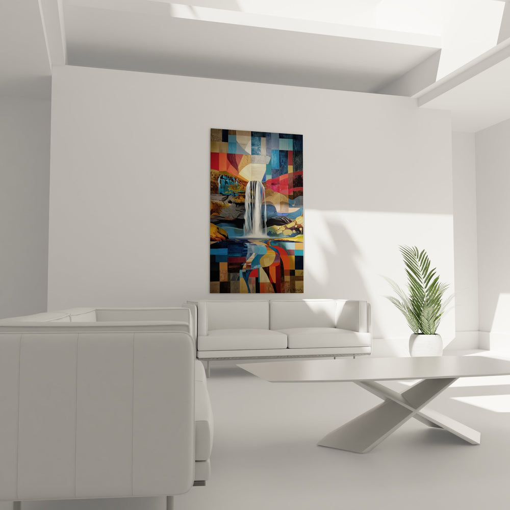 Ce magnifique tableau mural cascade présente une interprétation artistique saisissante où la nature rencontre l'art géométrique moderne. L'œuvre dépeint une cascade blanche majestueuse qui s'écoule au centre de la composition, entourée d'un paysage rocheux fragmenté en motifs géométriques colorés. Cette peinture murale cascade moderne transforme l'élément naturel de l'eau en une vision contemporaine où les formes rectangulaires et carrées se superposent harmonieusement. Les rochers environnants sont stylisés en blocs de couleurs vives : bleus profonds, rouges corail, jaunes dorés et verts émeraude qui contrastent avec le blanc pur de la chute d'eau. Cette décoration murale cascade artistique crée un effet visuel hypnotisant où chaque segment géométrique raconte une partie de l'histoire naturelle tout en apportant une dimension abstraite sophistiquée. L'artiste a magistralement équilibré réalisme et abstraction, offrant une œuvre d'art cascade contemporaine qui capture l'essence dynamique de l'eau en mouvement tout en proposant une esthétique résolument moderne adaptée aux intérieurs contemporains.