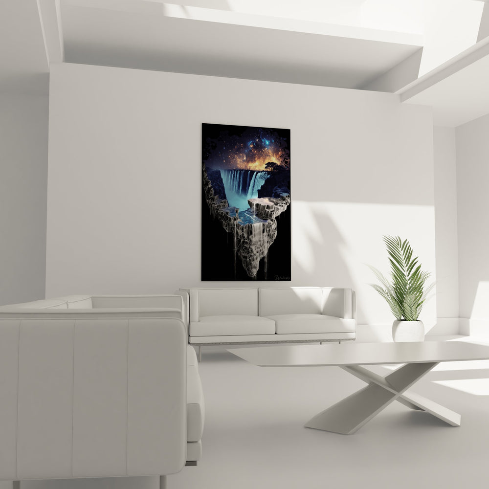 Ce tableau mural cascade présente une vision artistique extraordinaire où la nature rencontre l'art numérique contemporain. L'œuvre dépeint une cascade majestueuse aux eaux turquoise éclatantes qui s'écoulent depuis des falaises rocheuses, créant un spectacle naturel saisissant. Au-dessus de cette scène aquatique, un ciel étoilé cosmique révèle une galaxie aux teintes dorées et orangées, parsemée d'étoiles scintillantes et de nébuleuses lumineuses. La particularité de cette décoration murale moderne réside dans sa transformation géométrique progressive : la partie inférieure de l'image se métamorphose en formes cristallines et polygonales, créant un effet de fragmentation artistique saisissant. Ces structures géométriques blanches et translucides semblent flotter dans l'espace, établissant un contraste fascinant avec le réalisme photographique de la cascade. Un arbre solitaire se dresse sur la rive, ajoutant une dimension poétique à cette composition surréaliste. L'ensemble crée une harmonie parfaite entre les éléments naturels et les formes abstraites, offrant une œuvre d'art murale cascade qui transformera instantanément l'atmosphère de votre intérieur avec son style unique et captivant.