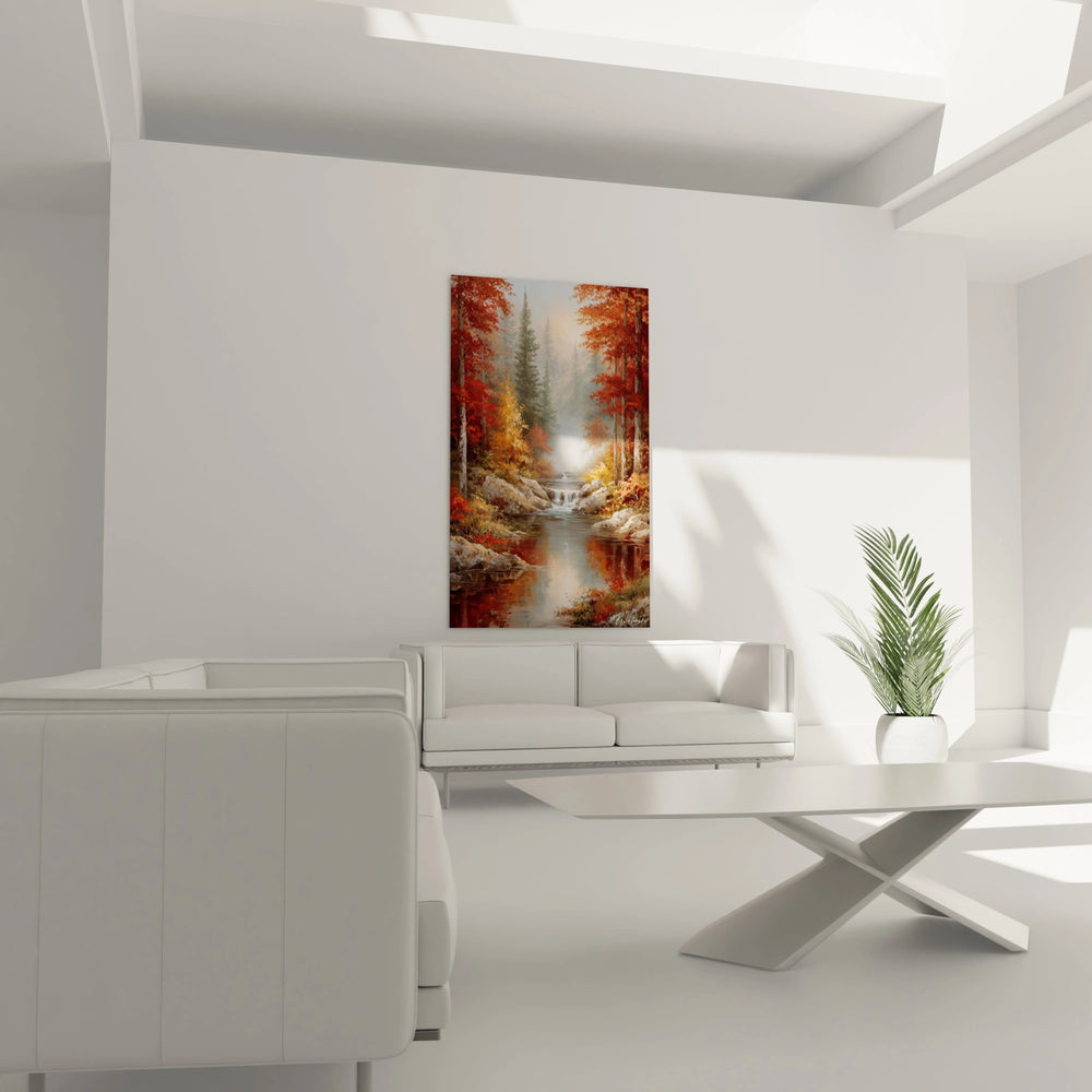 Ce tableau cascade automne révèle un paysage forestier d'une beauté saisissante, dominé par une chute d'eau majestueuse qui traverse un écrin de feuillages flamboyants. La composition présente un tableau cascade forêt rouge où les tons orangés et écarlates des érables créent un contraste spectaculaire avec les conifères vert sombre. Cette décoration murale cascade automnale capture l'essence même de la saison avec ses reflets dorés qui dansent sur l'eau cristalline. L'atmosphère vaporeuse qui enveloppe la scène confère à cette œuvre une dimension quasi mystique, transformant ce tableau cascade nature en véritable fenêtre sur un monde enchanté.