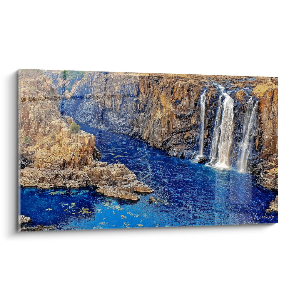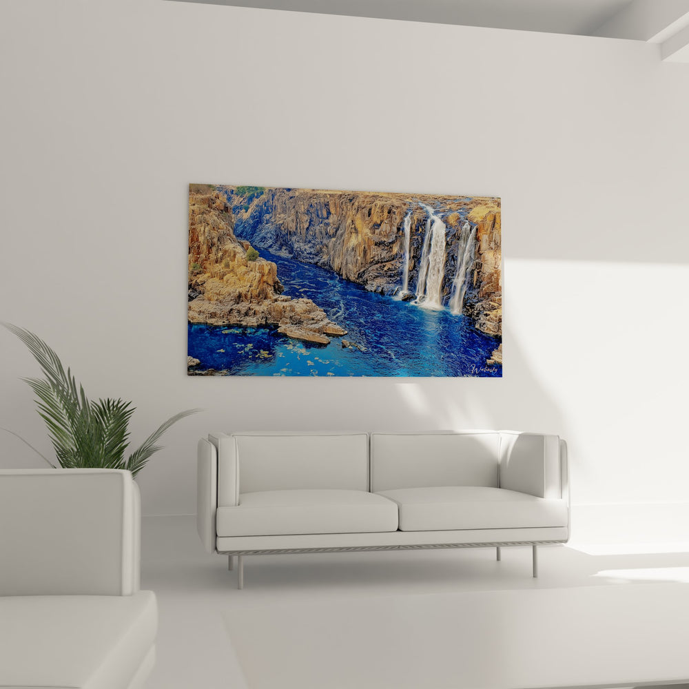 Ce tableau mural cascade présente une vision spectaculaire d'une cascade naturelle s'écoulant majestueusement dans une gorge aux parois rocheuses dorées. L'œuvre capture avec une précision saisissante les chutes d'eau cristallines qui se déversent en plusieurs voiles blancs écumants dans un bassin aux eaux d'un bleu profond et éclatant. Les formations géologiques environnantes, sculptées par le temps, révèlent une palette de couleurs chaudes allant de l'ocre au brun doré, contrastant harmonieusement avec l'azur intense de l'eau. Cette peinture cascade panoramique témoigne d'un travail minutieux sur les textures, où chaque détail rocheux est finement ciselé. Le tableau décoratif cascade évoque la puissance brute de la nature tout en dégageant une sérénité contemplative. Les reflets lumineux sur la surface aquatique et les jeux d'ombres dans les anfractuosités rocheuses créent une profondeur visuelle remarquable. Cette œuvre d'art cascade transformera instantanément votre espace de vie en fenêtre ouverte sur un paysage naturel d'exception, apportant fraîcheur et dynamisme à votre décoration murale.