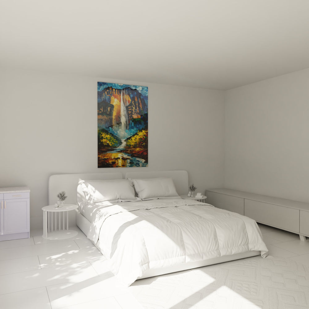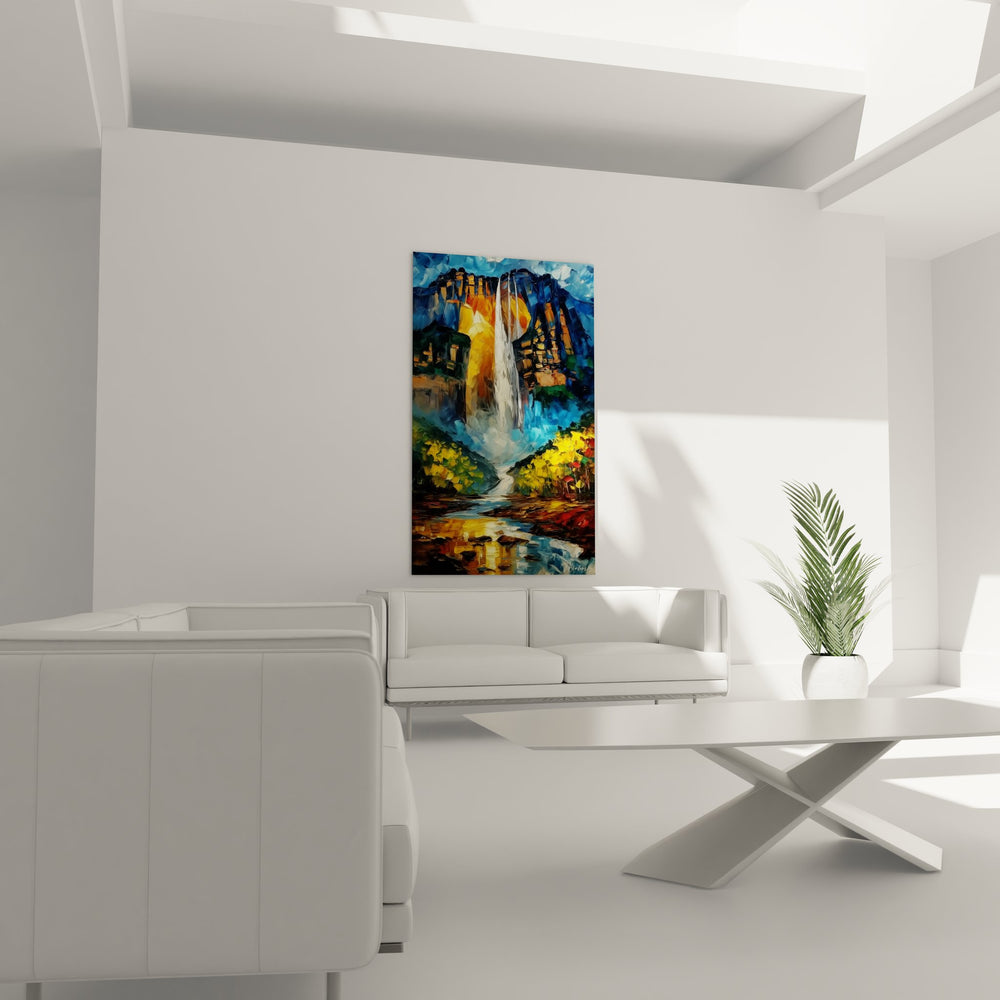 Ce tableau mural cascade présente une vision spectaculaire d'une chute d'eau monumentale se déversant depuis des falaises imposantes. L'artiste a magistralement capturé la puissance de cette cascade naturelle à travers une technique picturale impressionniste qui fait vibrer chaque détail. Les parois rocheuses, peintes dans des tons ocre et orange chaleureux, contrastent harmonieusement avec les bleus profonds du ciel tumultueux. La peinture cascade moderne révèle un jeu de lumière exceptionnel où les rayons solaires percent les nuages pour illuminer la roche d'une lueur dorée intense. Au premier plan, un cours d'eau serpente paisiblement, reflétant les couleurs flamboyantes de l'environnement. Cette œuvre d'art nature transforme l'espace en fenêtre ouverte sur un paysage grandiose. Les végétations luxuriantes qui bordent la scène apportent des touches de vert tendre et de jaune lumineux, créant un équilibre parfait avec la majesté minérale des falaises. Ce tableau décoratif cascade invite à la contemplation et au voyage, offrant une évasion immédiate vers des contrées sauvages et préservées.