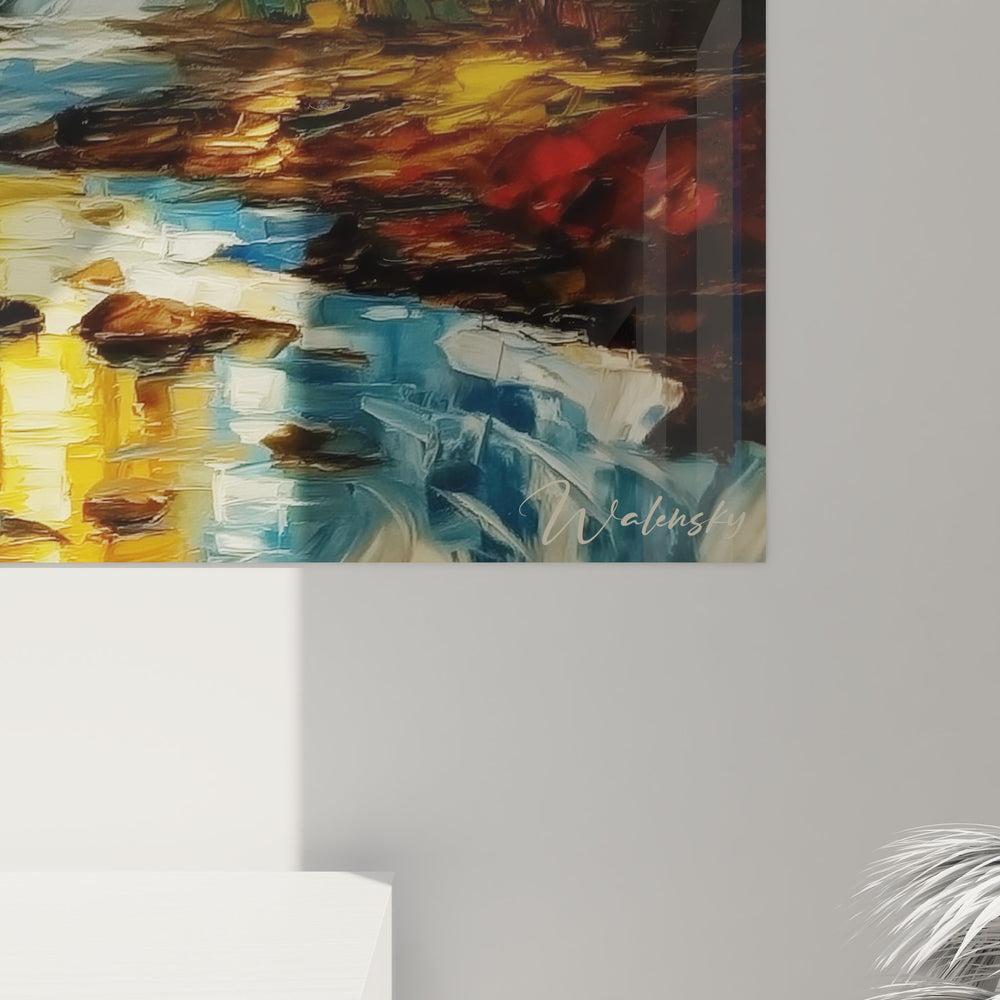 Cette toile cascade impressionniste puise sa force dans une palette chromatique riche et contrastée. Les bleus profonds du ciel évoquent l'immensité et la sérénité, tandis que les oranges et ocres des rochers symbolisent la terre nourricière et l'ancrage. Les reflets dorés représentent la lumière divine et l'illumination spirituelle, transformant cette cascade décorative en véritable hymne à la beauté naturelle et à la force créatrice de l'univers.