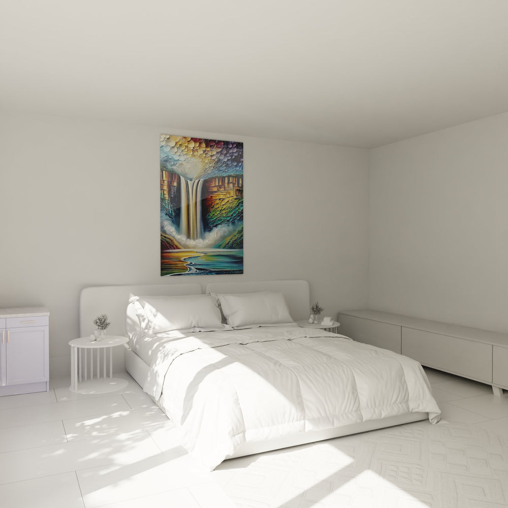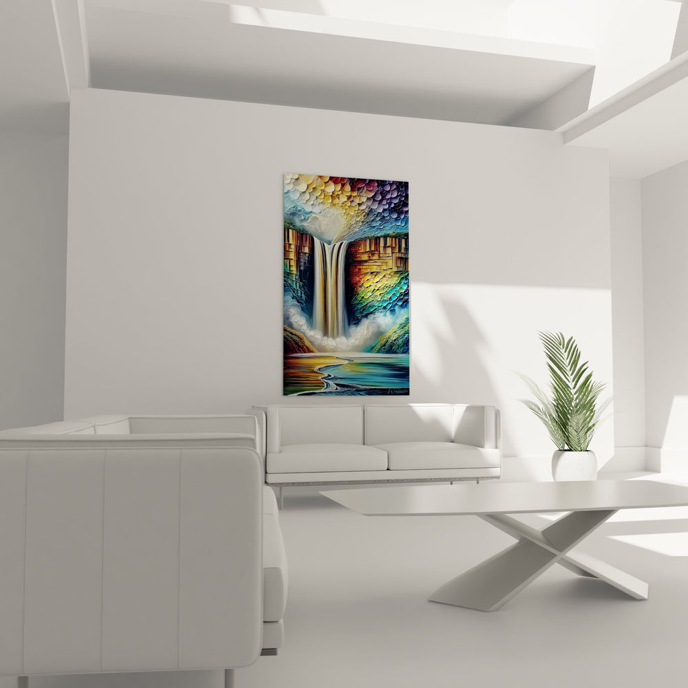 Ce tableau mural cascade présente une interprétation artistique extraordinaire d'une chute d'eau majestueuse aux dimensions impressionnantes. L'œuvre se distingue par son traitement visuel innovant où les textures écailleuses remplacent les éléments naturels traditionnels. La cascade centrale domine la composition avec ses multiples voiles d'eau qui se déversent depuis des falaises aux formations géologiques stylisées. Les parois rocheuses sont représentées par des motifs géométriques colorés évoquant des strates sédimentaires, créant un contraste saisissant avec la fluidité de l'eau. Au premier plan, un bassin naturel cascade reflète les couleurs environnantes dans des tons irisés. L'artiste a créé un univers où le réalisme se mêle à l'imaginaire, transformant cette décoration murale cascade en véritable portail vers un monde fantastique. Les effets de brume et d'embruns sont rendus par des nuages vaporeux qui s'élèvent de la base de la chute, ajoutant une dimension mystique à l'ensemble. Cette peinture cascade moderne revisite le thème classique des paysages aquatiques avec une approche contemporaine audacieuse.