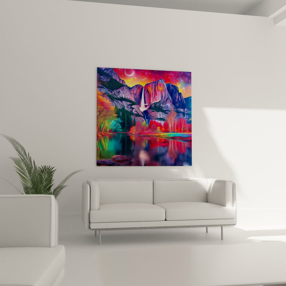 Tags : cascade psychédélique, montagne colorée, art mural moderne, paysage fantastique, décoration murale