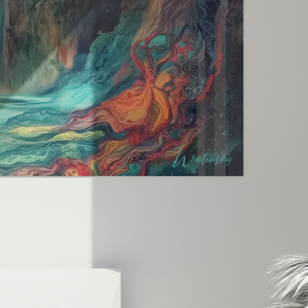 La symbolique cascade eau représente le flux de la vie et la transformation perpétuelle. Les teintes turquoise, or et rouge créent un contraste saisissant qui évoque les aurores boréales. Cette palette couleurs fantastique symbolise l'union entre les éléments terrestres and cosmiques, suggérant une harmonie universelle où chaque nuance raconte une histoire de création et de renaissance.