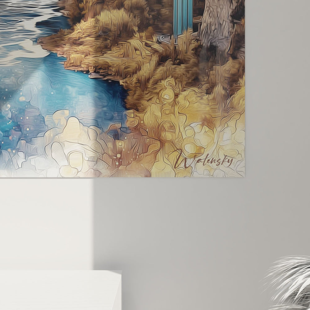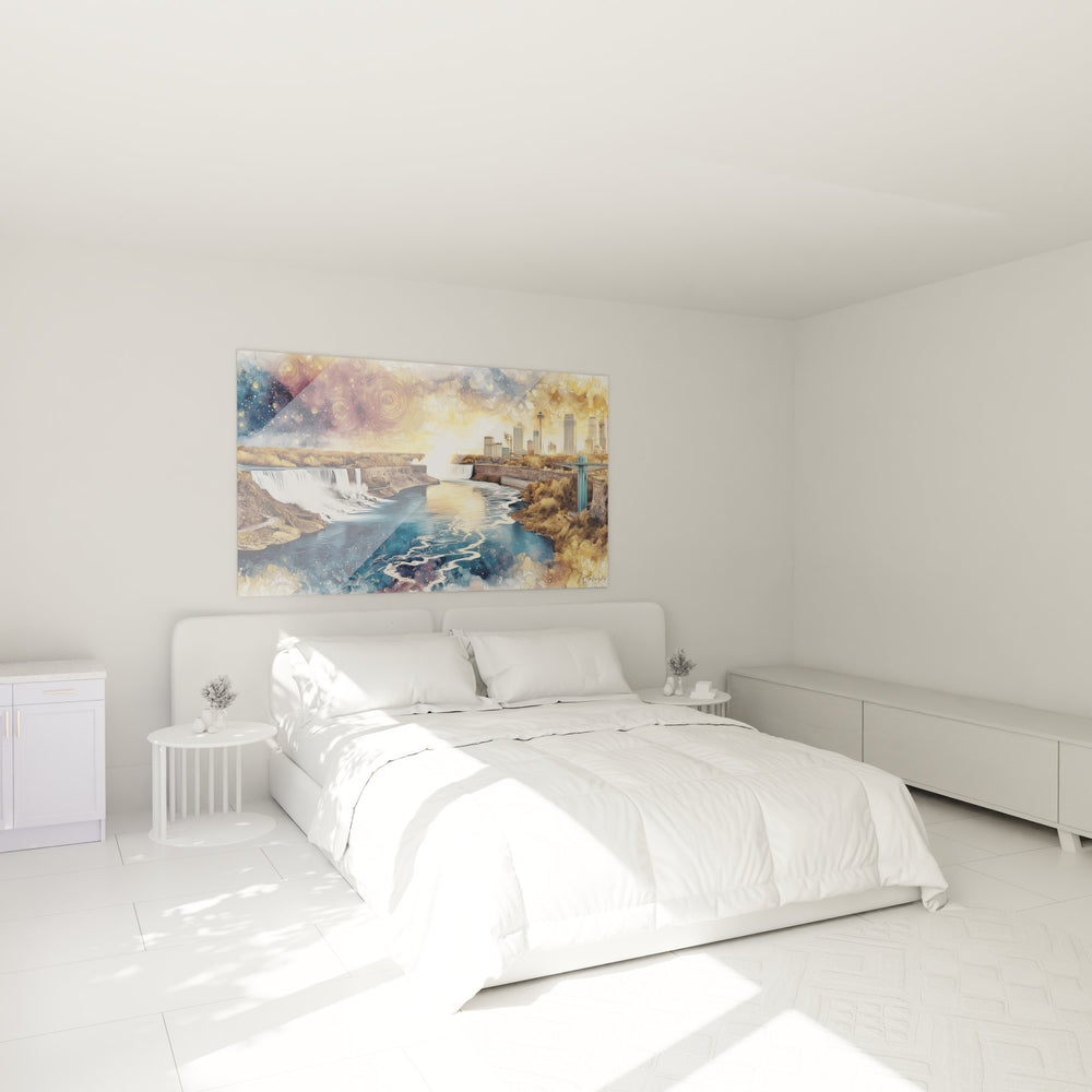 La palette chromatique de ce tableau artistique cascade oscille entre les bleus profonds de l'eau et les ors célestes du firmament. Les teintes violettes et rosées symbolisent la transition entre deux mondes, tandis que les reflets dorés évoquent l'espoir et la transcendance. Cette art mural cascade moderne utilise la symbolique de l'eau comme source de vie et de purification, contrastant avec l'aspect industriel de la métropole.