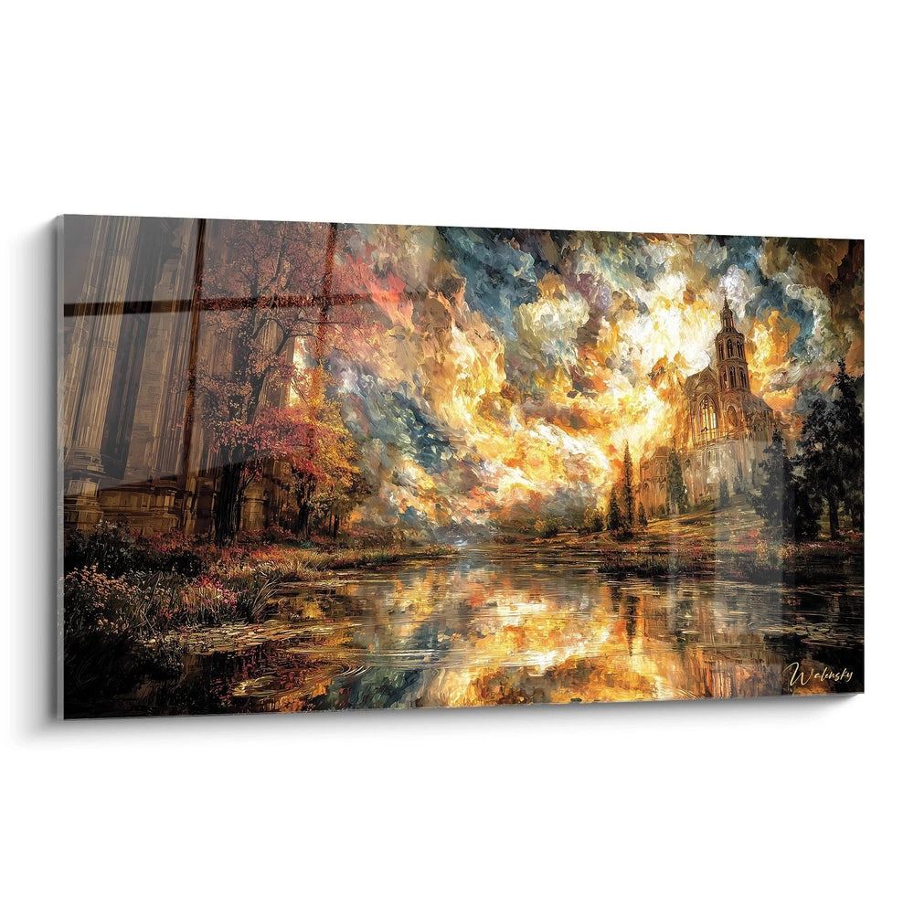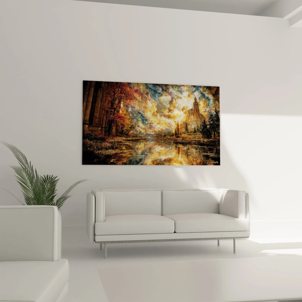 La composition s'organise selon une géométrie savamment orchestrée où la cathédrale occupe une position légèrement décentrée vers la droite du cadre. Cette œuvre cathédrale utilise les règles de la perspective pour créer une profondeur remarquable, guidant naturellement l'œil vers l'édifice principal. Les lignes verticales des tours et flèches contrastent harmonieusement avec l'horizontale de la surface aquatique. L'artiste a intégré des éléments de végétation automnale sur la gauche qui équilibrent parfaitement la masse architecturale. L'eau occupe près d'un tiers inférieur de la composition, servant de miroir et amplifiant l'impact visuel de ce tableau cathédrale style romantique. Les proportions respectent le nombre d'or, créant une harmonie naturelle entre tous les éléments.