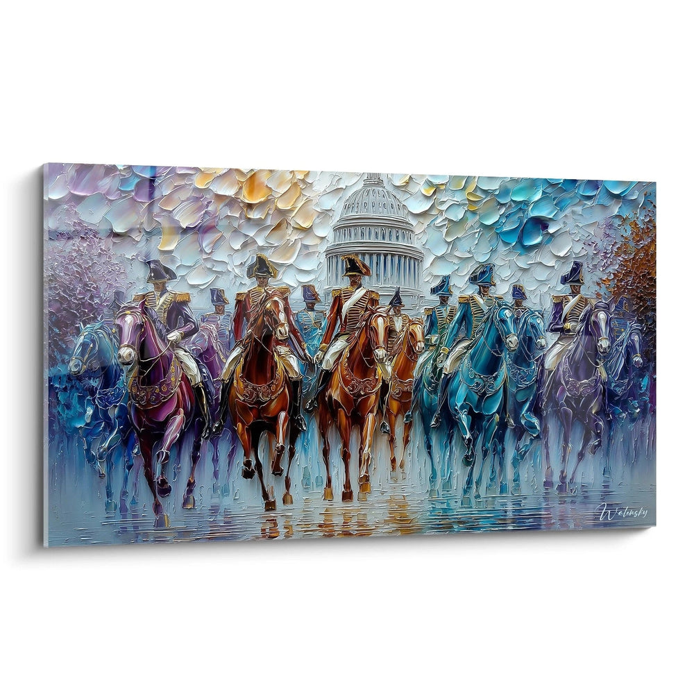 Cette art mural cavalerie développe une symphonie chromatique qui évoque à la fois la noblesse militaire et l'émotion romantique.
