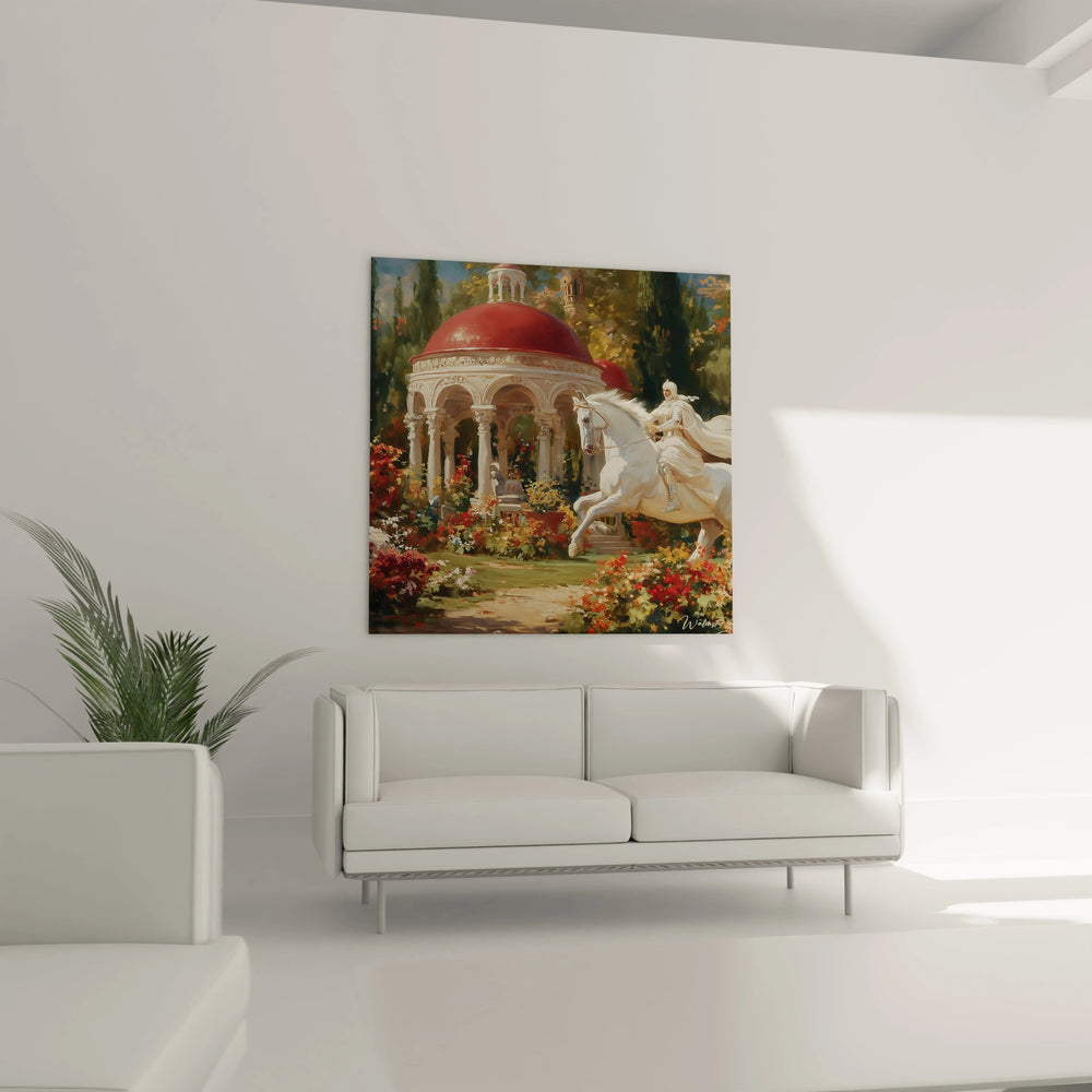 La palette chromatique se déploie autour d'un contraste saisissant entre les blancs purs et les rouges éclatants. Le rouge vermillon de la coupole dialogue avec les tons pourpres et orangés des fleurs épanouies dans le jardin. Cette art mural cavalier couleurs vives révèle une harmonie chaude ponctuée par les verts profonds du feuillage.