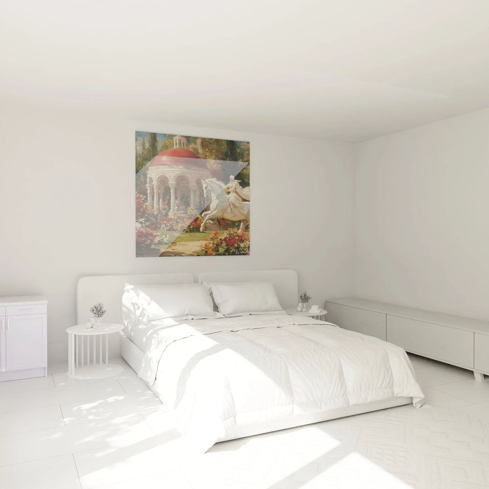Cette œuvre présente un cavalier oriental majestueux monté sur un cheval blanc immaculé, évoluant devant une architecture mauresque somptueuse. Le tableau cavalier oriental capture un moment d'élégance équestre dans un jardin luxuriant aux mille couleurs. L'architecture à coupole rouge écarlate et aux colonnes sculptées forme un décor somptueux, tandis que la décoration murale cavalier blanc révèle une scène empreinte de noblesse orientale. Les drapés flottants du personnage et la posture cabrée du destrier confèrent une dynamique théâtrale à cette composition raffinée.