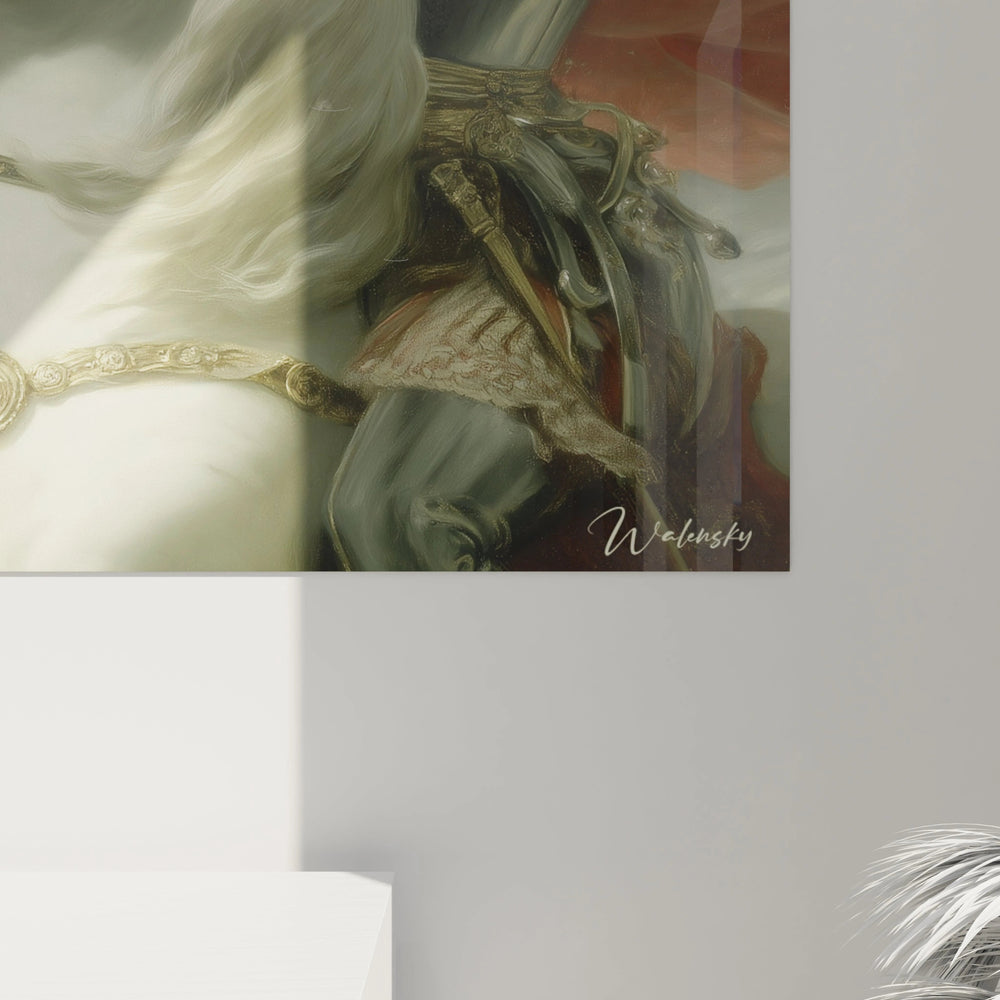 Cette art mural héroïque se distingue par plusieurs éléments visuels exceptionnels qui la rendent irremplaçable. L'expression du cavalier révèle une détermination farouche mêlée à une noblesse naturelle, captée dans un moment de parfaite intensité dramatique. Le harnachement doré du cheval présente des motifs décoratifs d'une finesse extraordinaire, témoignant du rang élevé du personnage. La signature "Wolinsky" en bas à droite authentifie cette création artistique. L'effet de mouvement figé, avec la crinière flottante et la posture dynamique, crée une tension visuelle unique. Cette œuvre équestre combine harmonieusement réalisme technique et idéalisation héroïque, caractéristique des plus grands maîtres. L'équilibre parfait entre précision documentaire et élévation poétique confère à cette représentation une dimension intemporelle.