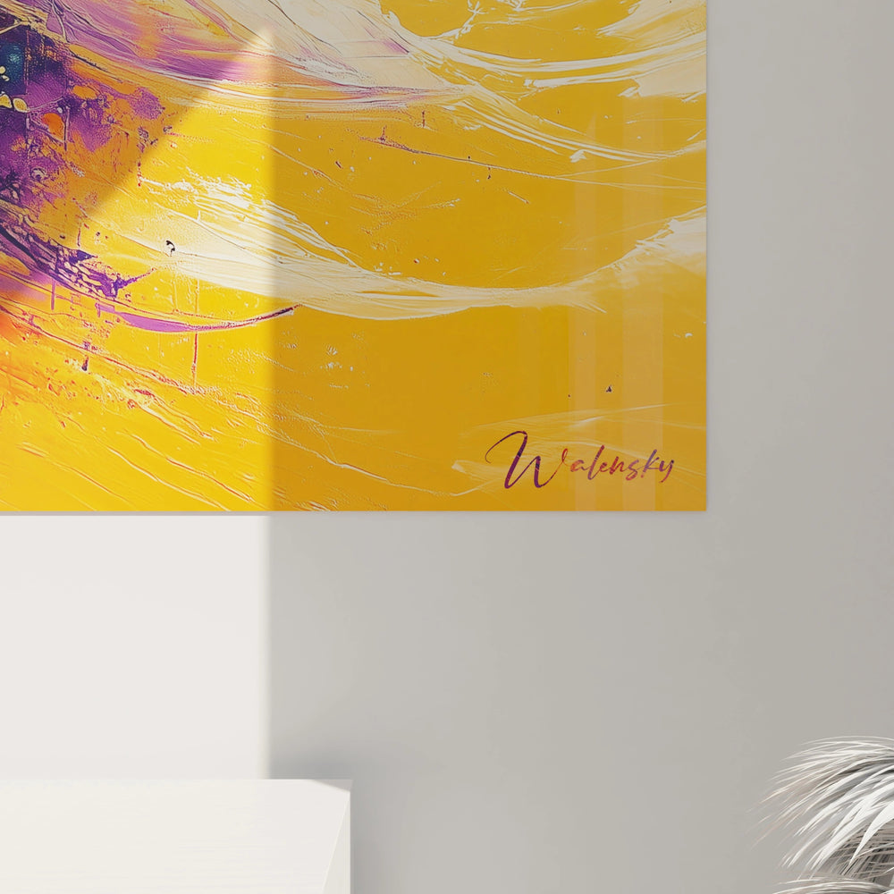 La palette chromatique de cette œuvre s'articule autour d'un contraste spectaculaire entre couleurs chaudes et froides. Le fond présente un jaune orangé vibrant et lumineux qui irradie d'énergie, tandis que le sujet est principalement rendu dans des tons de bleu marine profond et de violet intense. Ces teintes complémentaires créent une tension visuelle électrisante qui amplifie le dynamisme de la composition.