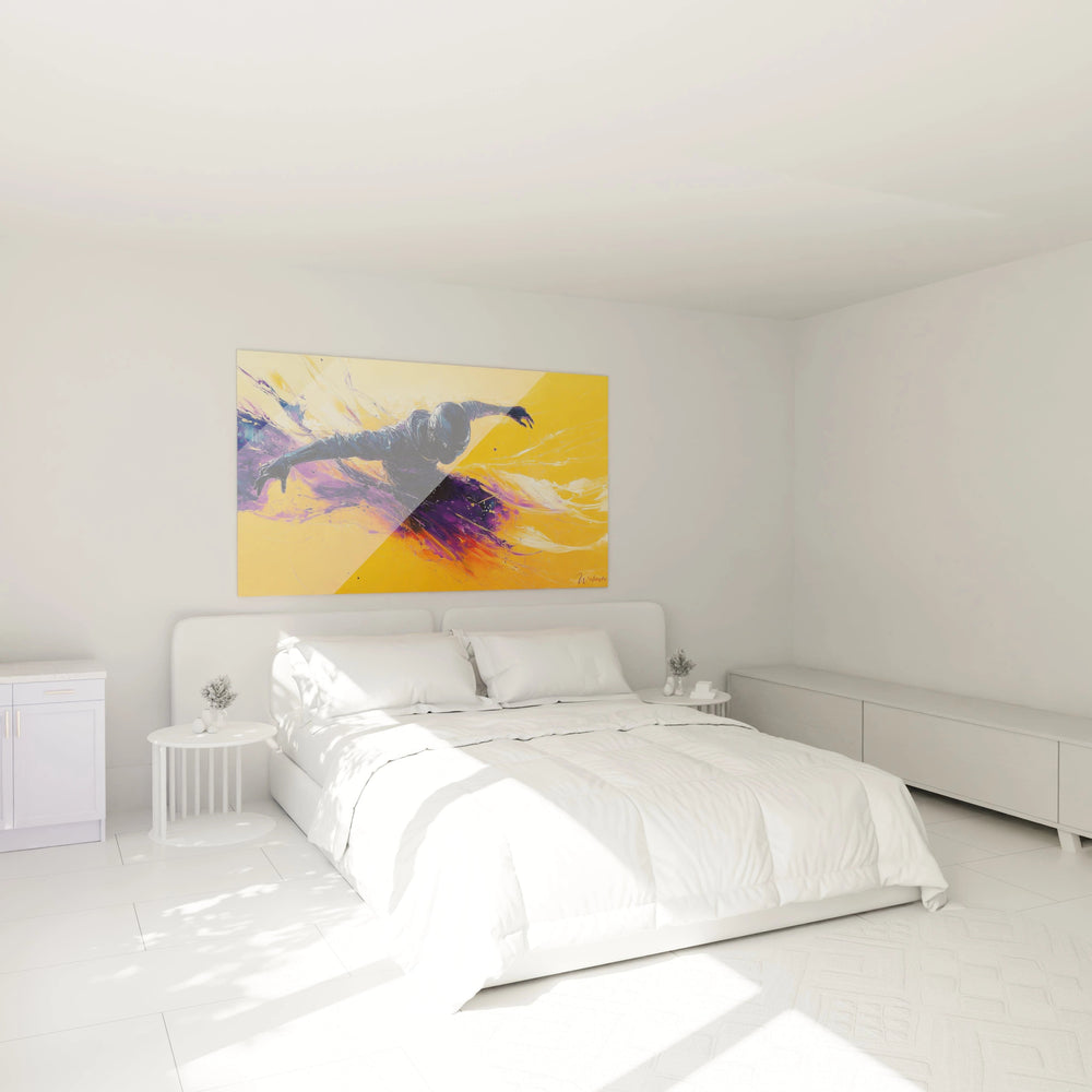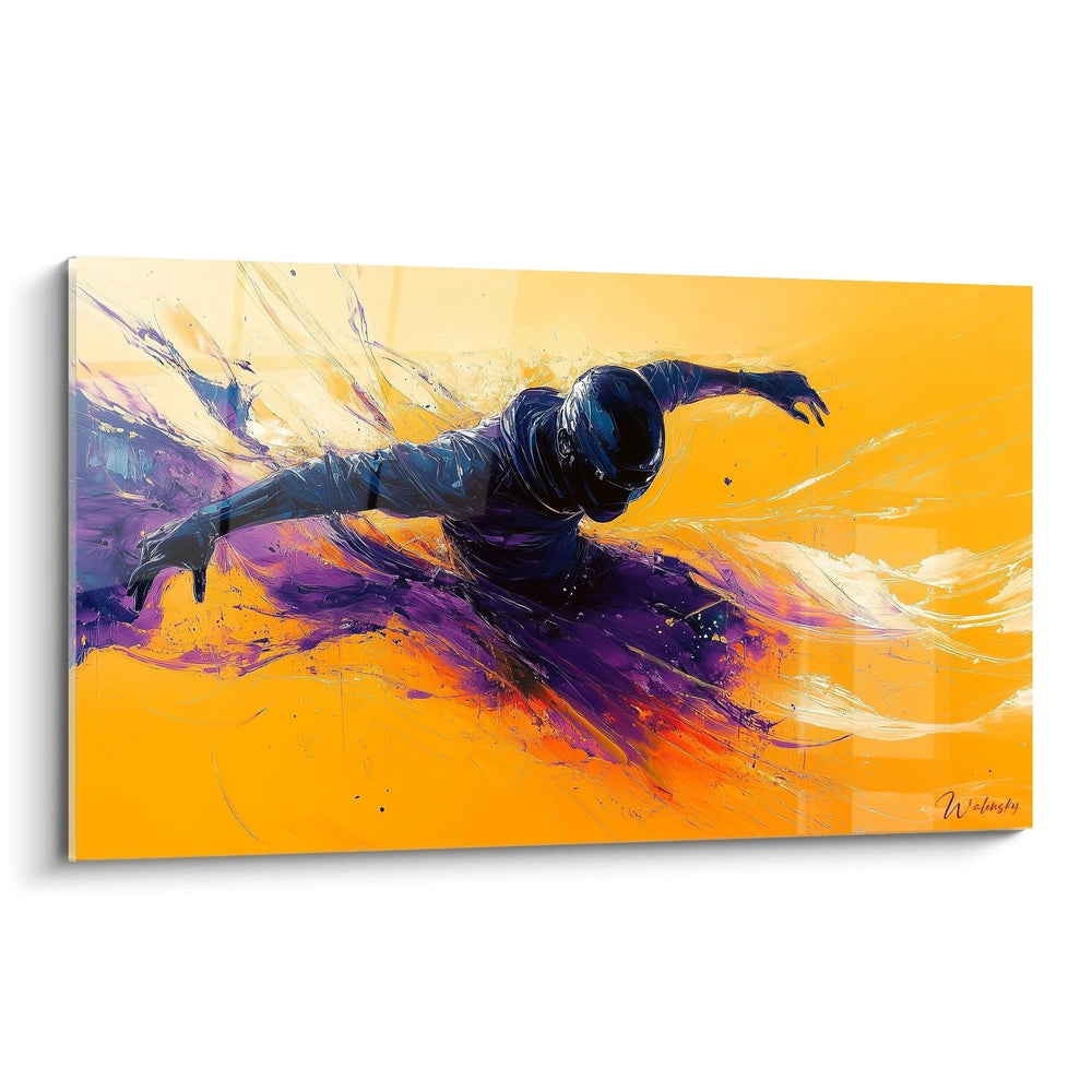 Ce tableau mouvement urbain captivant représente une silhouette en pleine action, vêtue d'une tenue sombre et d'un casque, se déployant dynamiquement sur un fond jaune éclatant. L'œuvre frappe immédiatement par son contraste saisissant entre la figure obscure et l'arrière-plan lumineux. La composition capture parfaitement l'instant suspendu d'un saut ou d'une figure acrobatique, évoquant les sports extrêmes urbains. Des éclaboussures violettes et des traînées blanches créent un effet de mouvement fluide autour du sujet principal.