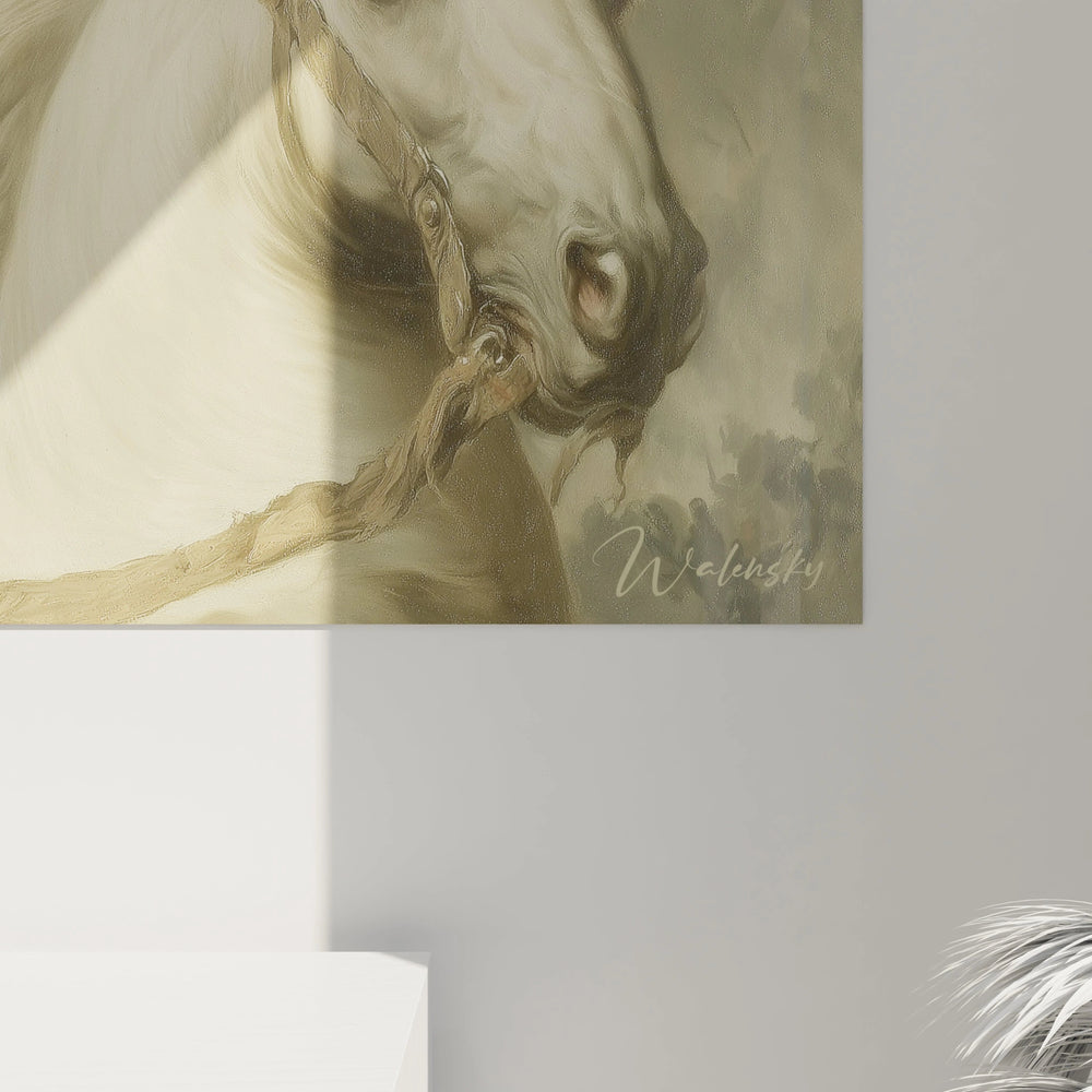 Cette art mural cavalier utilise la technique du clair-obscur pour créer des effets de lumière dramatiques qui renforcent l'impact émotionnel de l'ensemble.