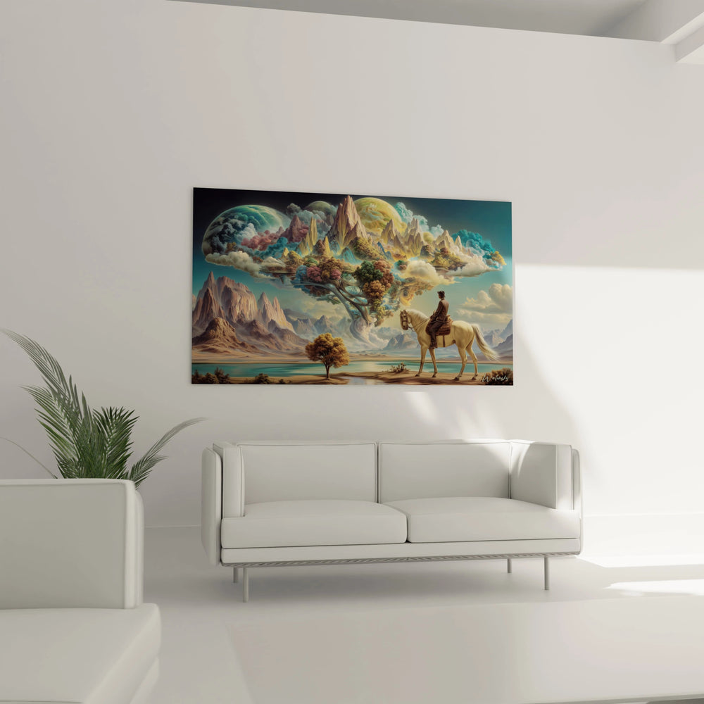 Ce tableau cavalier paysage surréaliste présente une composition extraordinaire mêlant réalisme et fantastique dans un équilibre visuel saisissant. L'œuvre dévoile un cavalier solitaire contemplant un arbre-île flottant dans les airs, créant une atmosphère onirique typique du mouvement surréaliste. La décoration murale cavalier contemplatif captive immédiatement par son élément central : un arbre aux feuillages multicolores suspendu entre ciel et terre, défiant les lois de la pesanteur. Cette vision impossible transforme un paysage traditionnel en univers fantastique, où montagnes acérées et eaux cristallines servent d'écrin à cette manifestation surréaliste.