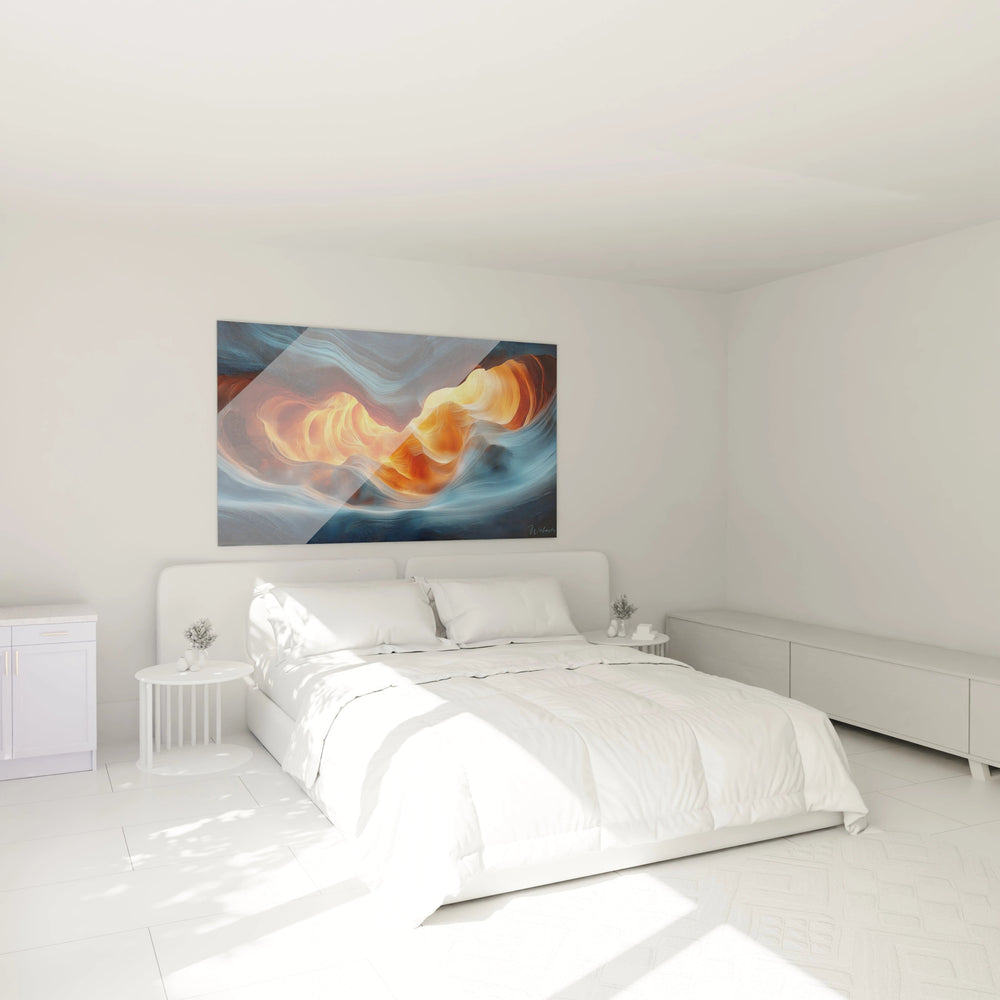 Les ondulations fluides dominent ce tableau canyon, créant une impression de mouvement perpétuel figé dans le temps. L'élément distinctif de cette œuvre est la façon dont les tons orangés et dorés semblent émaner de l'intérieur même de la structure, comme si la roche elle-même était source de lumière, contrastant avec le bleu profond qui suggère la fraîcheur et l'ombre des formations rocheuses.