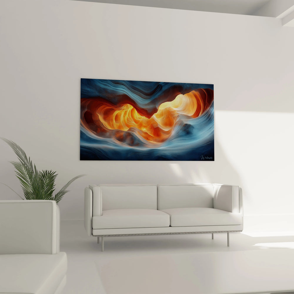 Les détails uniques qui distinguent ce tableau canyon incluent la fluidité exceptionnelle des lignes qui évoquent un mouvement perpétuel, comme si la roche elle-même était encore en formation. Cette décoration murale géologique présente également une palette chromatique particulièrement saisissante, où le contraste entre les bleus profonds et les orangés lumineux atteint une intensité rarement observée dans les représentations plus conventionnelles de paysages naturels, tout en maintenant une harmonie visuelle parfaite.