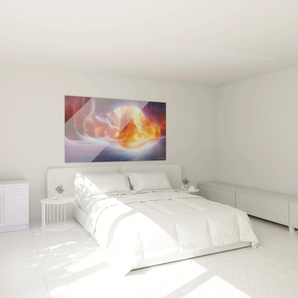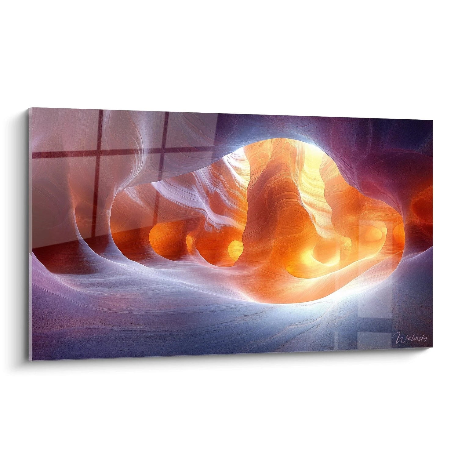 Ce tableau canyon lumineux captive immédiatement par sa composition spectaculaire mettant en scène une formation rocheuse aux courbes douces et ondulantes. La cavité naturelle semble sculptée par des millénaires d'érosion, créant un jeu fascinant entre ombre et lumière. L'ouverture centrale baignée d'une lumière dorée contraste magnifiquement avec les parois violacées qui l'entourent. Cette œuvre saisit parfaitement l'instant où les rayons lumineux pénètrent dans la grotte, révélant les textures lisses et les formes organiques de la pierre façonnée par l'eau et le temps.