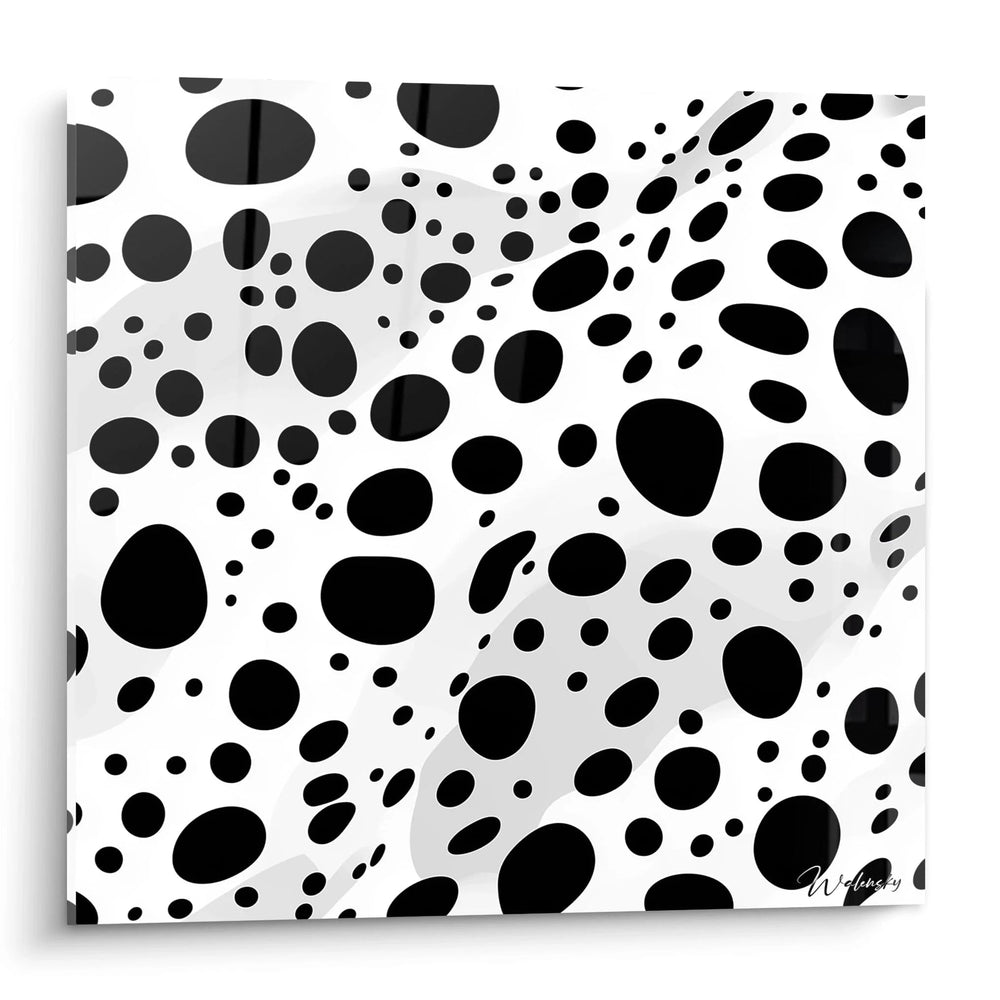 L'harmonie chromatique de ce tableau tacheté noir et blanc repose sur l'utilisation magistrale du contraste maximal. Le noir profond des taches possède une qualité absorbante qui crée un ancrage visuel fort, tandis que le blanc lumineux de l'arrière-plan apporte légèreté et espace. Ce dialogue entre présence et absence génère une tension visuelle captivante qui maintient l'attention du spectateur.