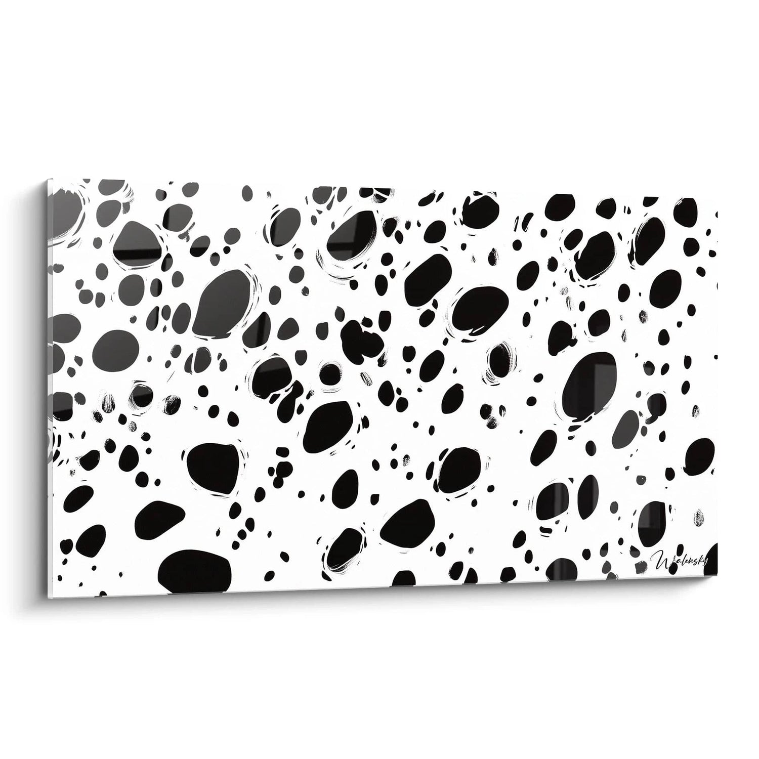 Les taches blanches se posent avec grâce sur un fond noir profond, dessinant un jeu visuel rythmé et captivant. Ce ballet monochrome révèle un dialogue entre le plein et le vide, offrant une sensation de mouvement tout en instaurant un calme élégant. Votre regard se promène, explorant la texture et les formes qui semblent vibrer sur la surface, comme si cette création vivait au rythme de votre espace.