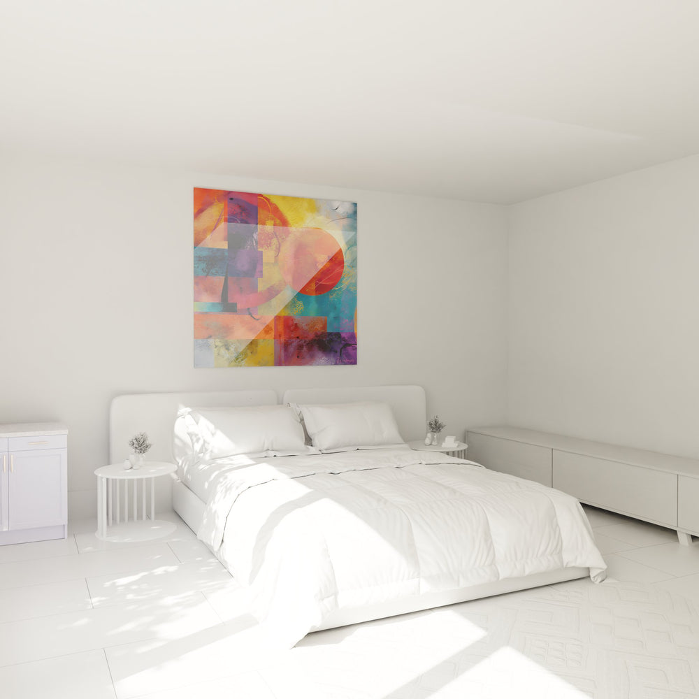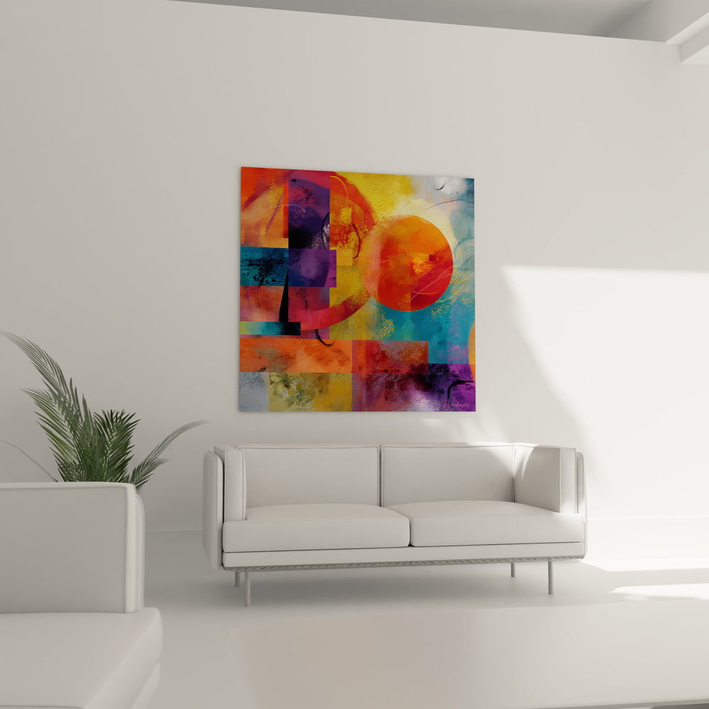 La palette chromatique de ce tableau abstrait géométrique évoque l'énergie solaire avec son cercle orange central, symbole de vitalité et de créativité. Les bleus et violets apportent sérénité et profondeur, créant un contraste dynamique avec les tons chauds. Cette harmonie colorée reflète l'équilibre entre passion et contemplation, caractéristique de l'art géométrique moderne.