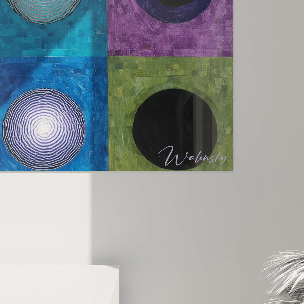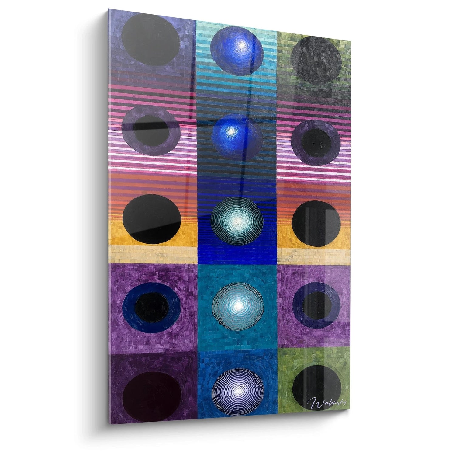 L'unicité de ce tableau cercles concentriques grille réside dans sa capacité à créer un dialogue entre uniformité et variation. Chaque cercle, bien que similaire dans sa forme basique, développe sa propre personnalité chromatique et texturale. Les cercles lumineux de la colonne centrale semblent pulser d'une énergie interne, créant des points focaux hypnotiques. La signature visible dans le coin inférieur droit authentifie cette création originale. Les proportions parfaitement calculées entre les cercles et leurs cadres colorés révèlent une approche mathématique de la composition. Cette art mural cercles géométriques ne peut être dupliquée dans ses nuances subtiles de couleurs et ses effets de matière spécifiques.