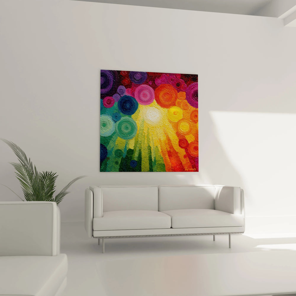 Cette œuvre s'épanouit particulièrement dans les espaces contemporains aux tons neutres, où sa vivacité peut pleinement s'exprimer. Un éclairage LED blanc chaud révèle optimalement la richesse chromatique sans altérer les nuances. Les murs blancs ou gris clair créent un contraste parfait pour cette décoration murale arc-en-ciel pointilliste. L'œuvre dialogue harmonieusement avec des matériaux naturels comme le bois clair ou la pierre blanche. Une distance d'observation de 2 à 3 mètres permet d'apprécier l'effet d'ensemble tout en percevant les détails. Cette art mural énergie chromatique transforme instantanément l'atmosphère d'un salon, bureau ou espace d'accueil par sa présence dynamique et joyeuse.