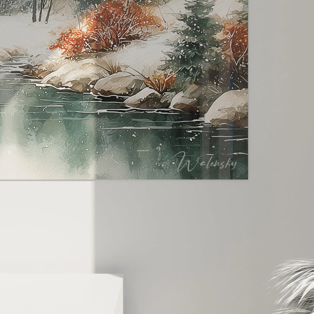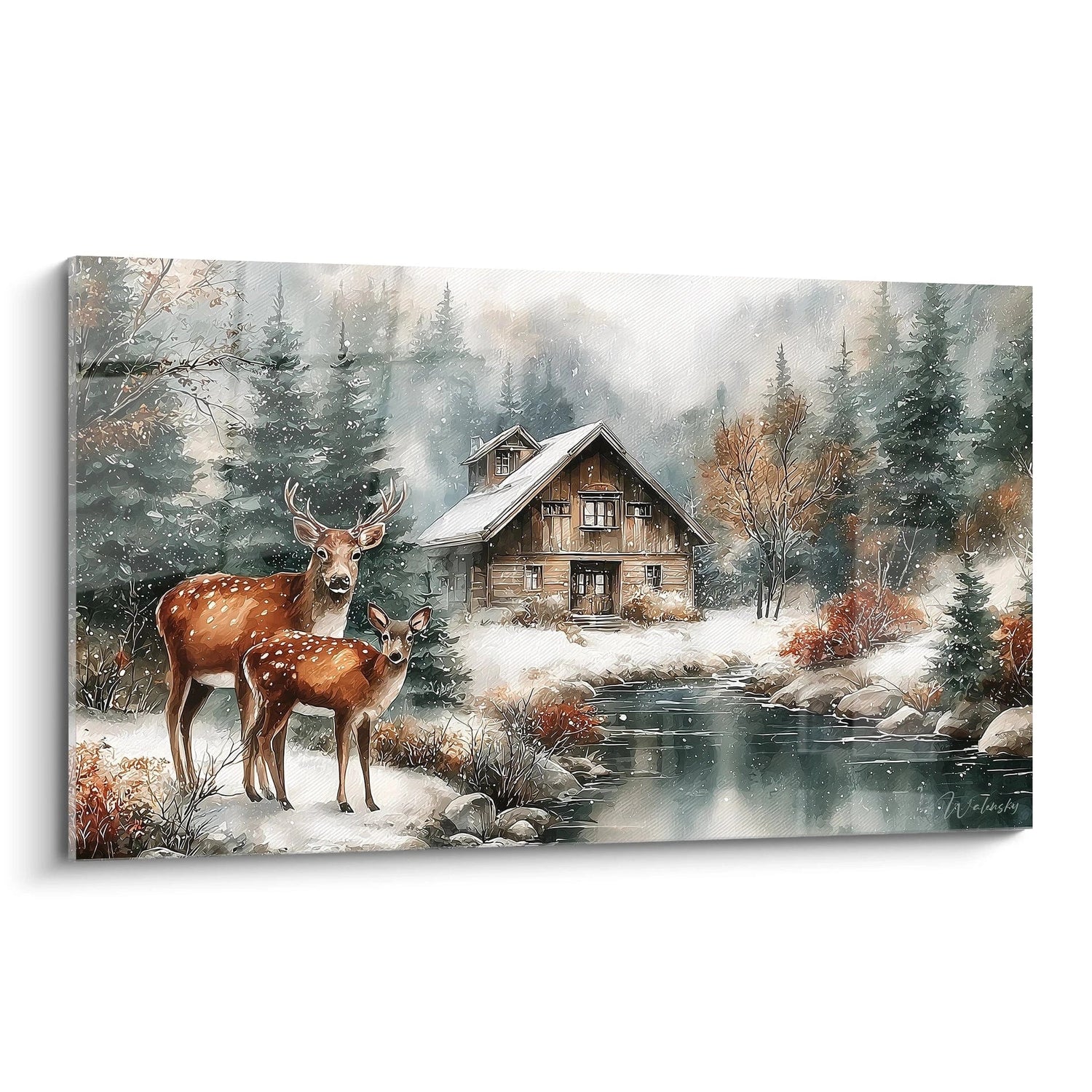 Plusieurs éléments distinctifs différencient cette œuvre cerfs hiver des représentations conventionnelles de la faune hivernale. La relation émotionnelle entre les deux cervidés constitue le point focal principal, suggérant une narration sous-jacente de protection et de tendresse familiale. La cabane en arrière-plan ajoute une dimension humaine discrète sans perturber l'harmonie naturelle. Ce tableau cerfs chute neige capture un moment fugace où les flocons semblent suspendus dans l'air, créant une temporalité particulière. L'intégration harmonieuse du cours d'eau, qui continue de s'écouler malgré le froid, symbolise la persistance de la vie. Les proportions parfaitement équilibrées entre les éléments naturels et architecturaux créent une composition unique impossible à dupliquer.