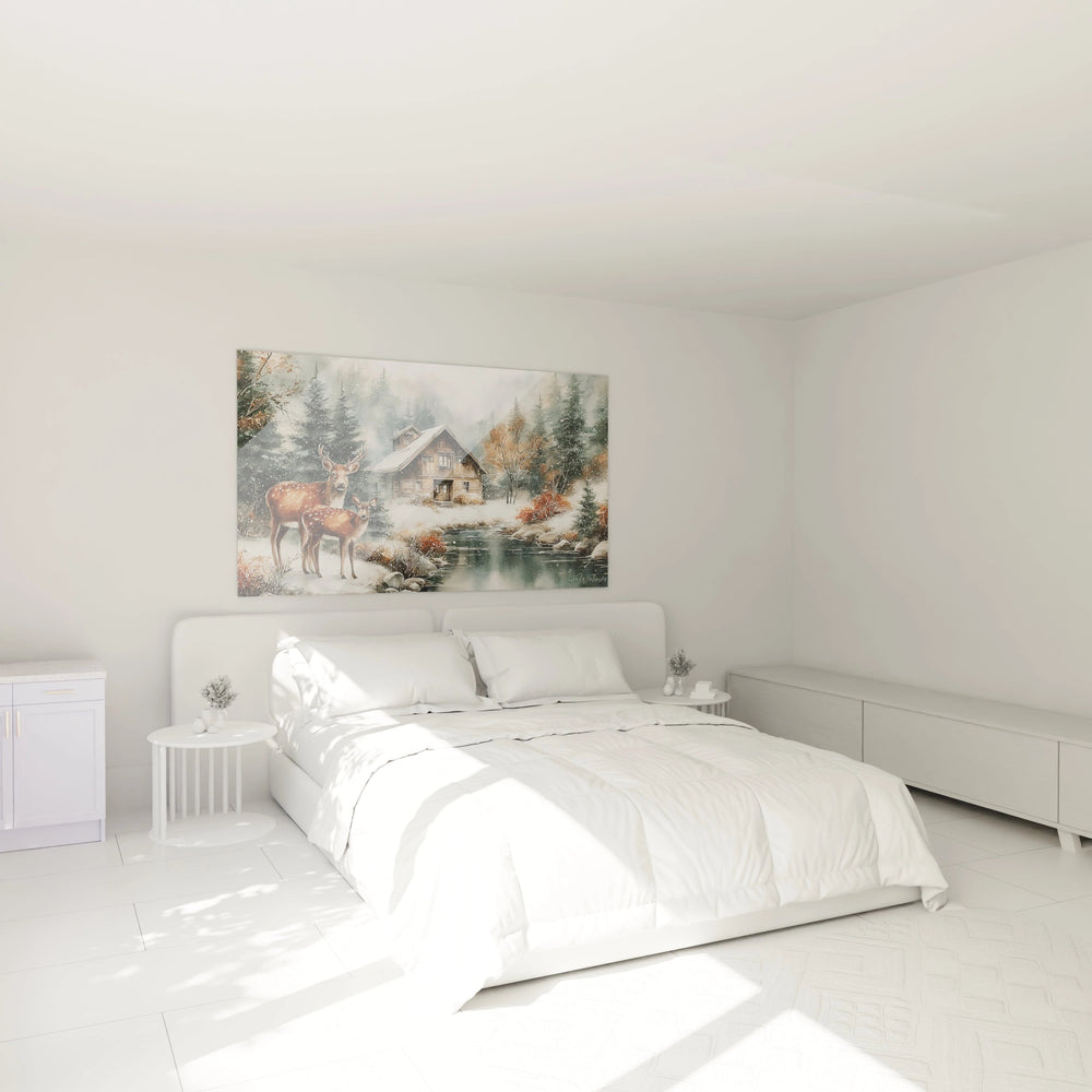 Cette décoration murale cerfs présente des contrastes subtils qui accentuent la profondeur sans créer de rupture visuelle. Les tonalités froides dominent l'arrière-plan tandis que les nuances chaudes ponctuent le premier plan, créant une perspective colorée naturelle qui renforce l'impact émotionnel de tranquillité hivernale.