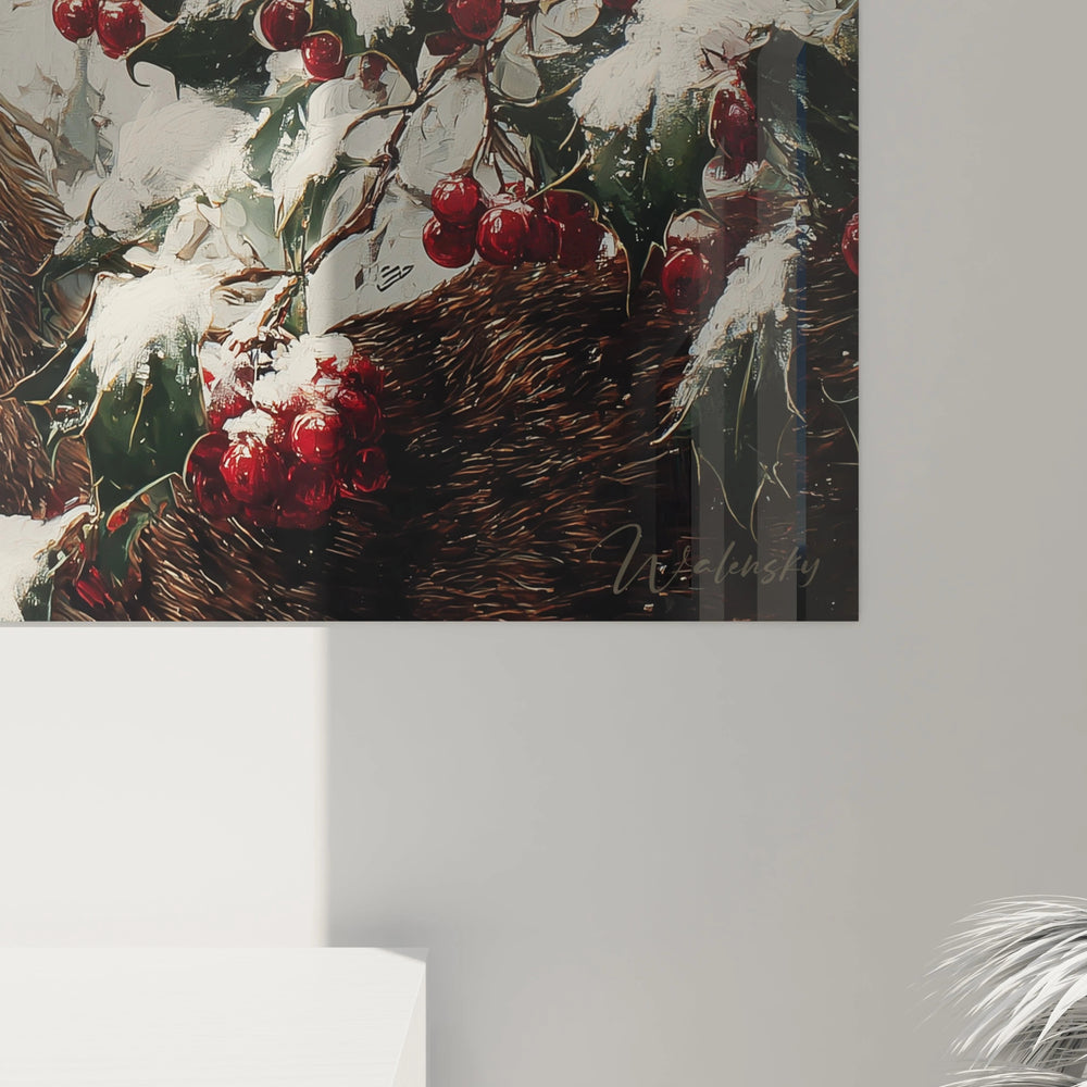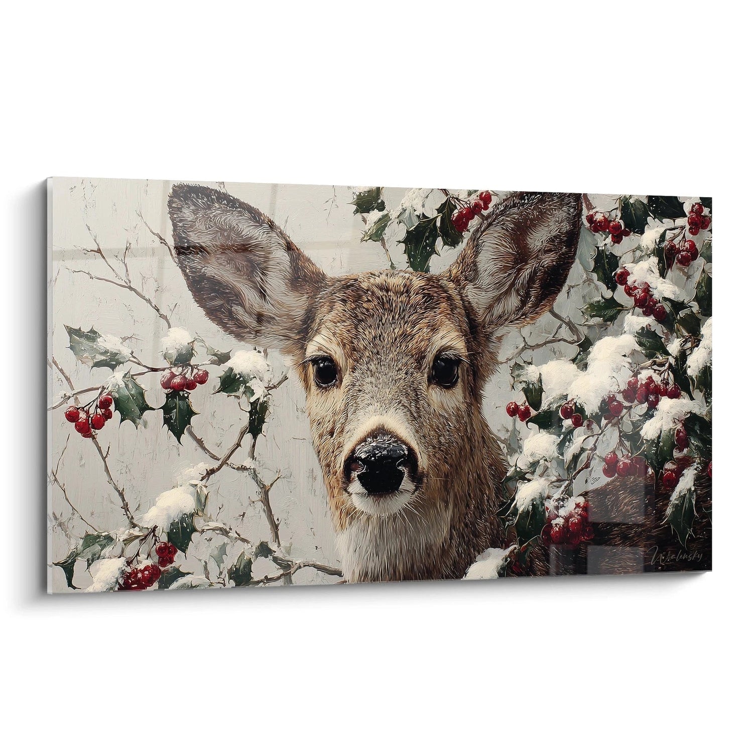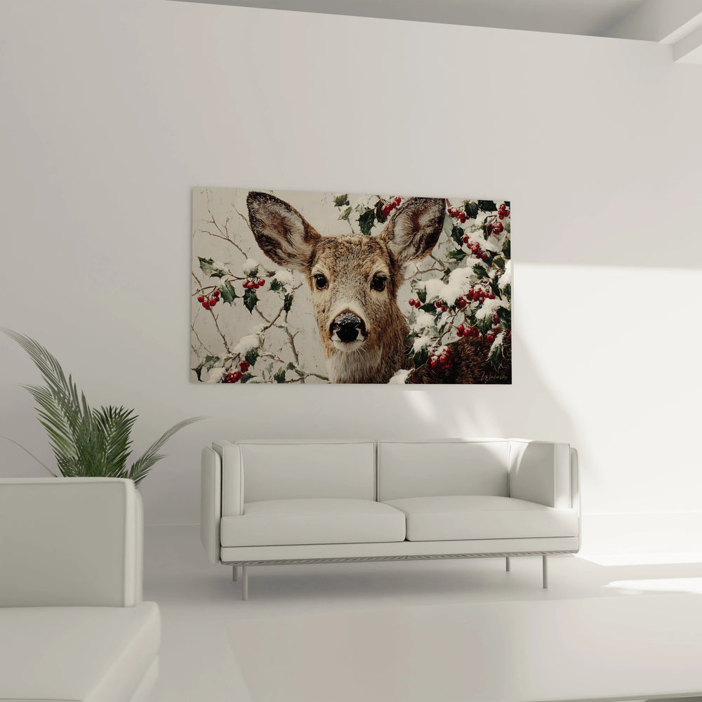 Ce tableau cerf hivernal aux baies rouges présente un portrait saisissant d'un cervidé au regard profond, encadré par une végétation hivernale délicate. L'œuvre révèle un tableau cerf réaliste où chaque détail anatomique est finement travaillé, de la texture soyeuse du pelage fauve aux oreilles dressées avec attention. Les yeux sombres de l'animal captent immédiatement l'attention, créant une connexion émotionnelle directe avec l'observateur. Cette décoration murale cerf se distingue par son atmosphère contemplative et la présence de baies rouge vif qui ponctuent harmonieusement la composition hivernale.