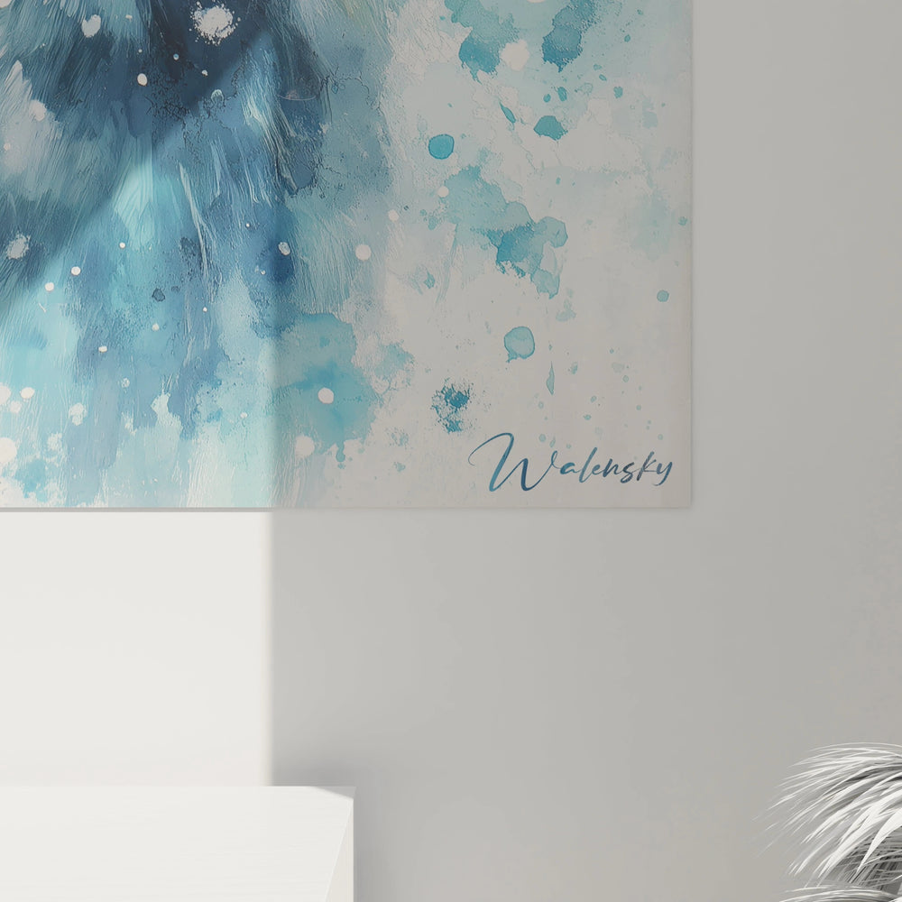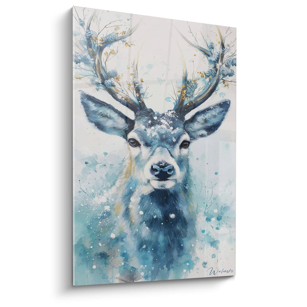 Ce tableau cerf captive immédiatement par son portrait saisissant d'un cerf aux bois majestueux, baigné dans une palette de bleus profonds et de blancs nacré. L'animal se détache avec une présence magnétique sur un fond aux tonalités hivernales, créant une atmosphère contemplative remarquable. Le tableau cerf bleu aquarelle révèle une technique artistique sophistiquée où les couleurs se fondent harmonieusement. Les éclaboussures dorées parsemées sur la composition ajoutent une dimension lumineuse qui transforme cette décoration murale cerf en véritable point focal. Le regard intense de l'animal, souligné par des yeux sombres expressifs, établit une connexion émotionnelle immédiate avec l'observateur.