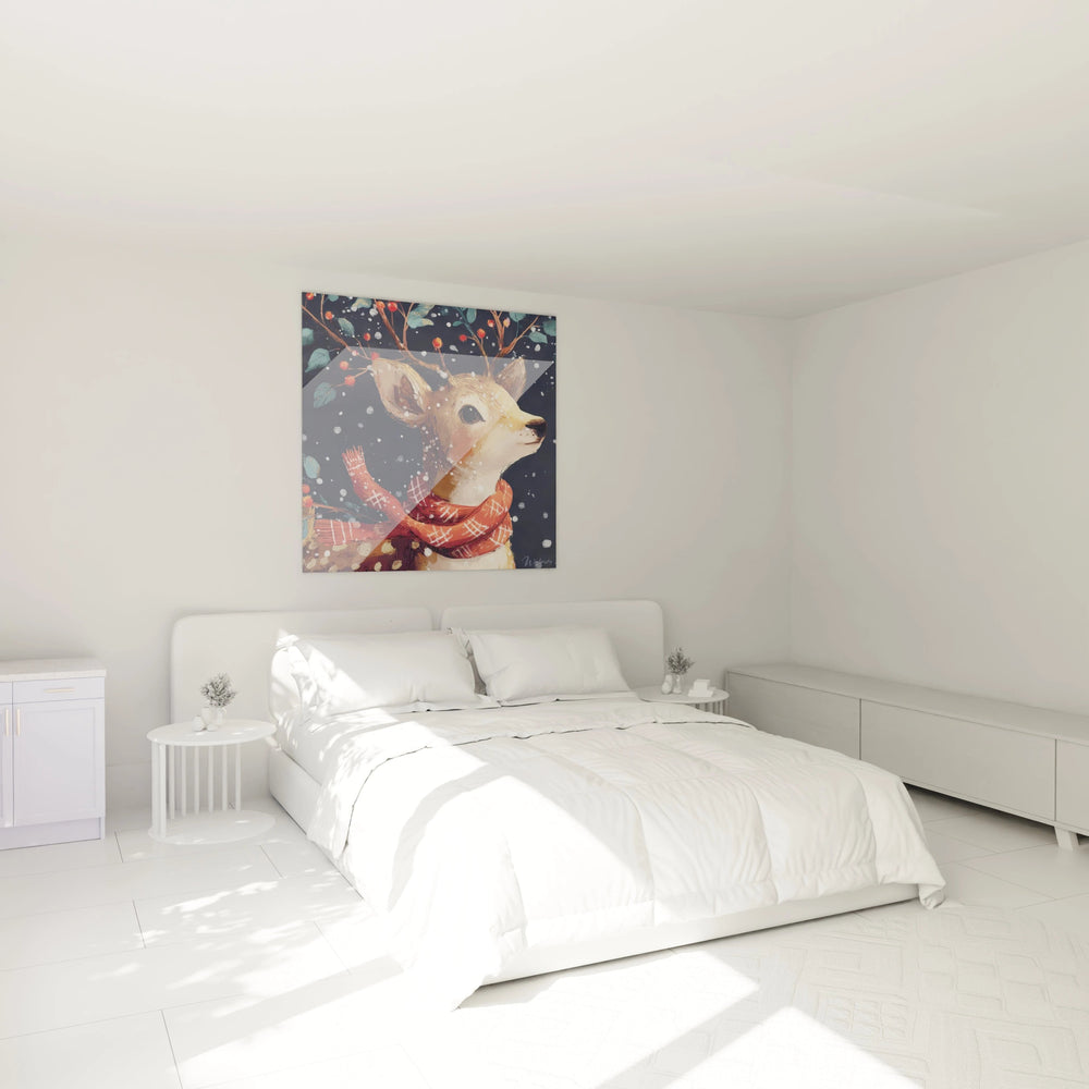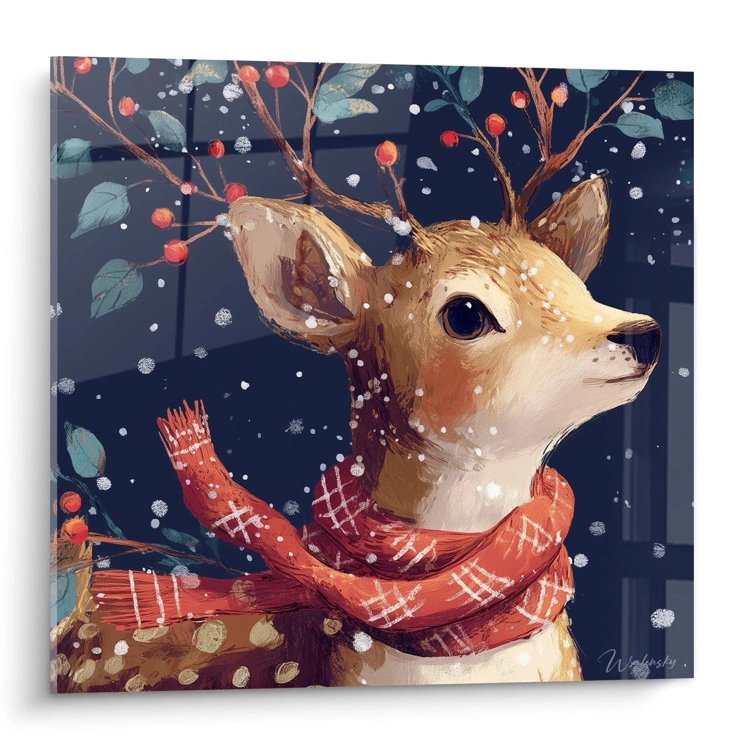 Ce tableau cerf présente une œuvre d'art captivante mettant en scène un jeune cerf dans un environnement hivernal féerique. L'animal, représenté avec une remarquable délicatesse, porte un écharpe rouge à motifs géométriques qui contraste magnifiquement avec son pelage doré aux nuances subtiles. Le tableau cerf écharpe rouge révèle immédiatement son caractère chaleureux et accueillant. Des bois ornés de baies colorées et de feuillage créent une couronne naturelle au-dessus de sa tête, tandis que des flocons de neige parsèment délicatement l'ensemble de la composition. Cette décoration murale cerf hivernal capture parfaitement l'essence de la saison froide avec une poésie visuelle saisissante.