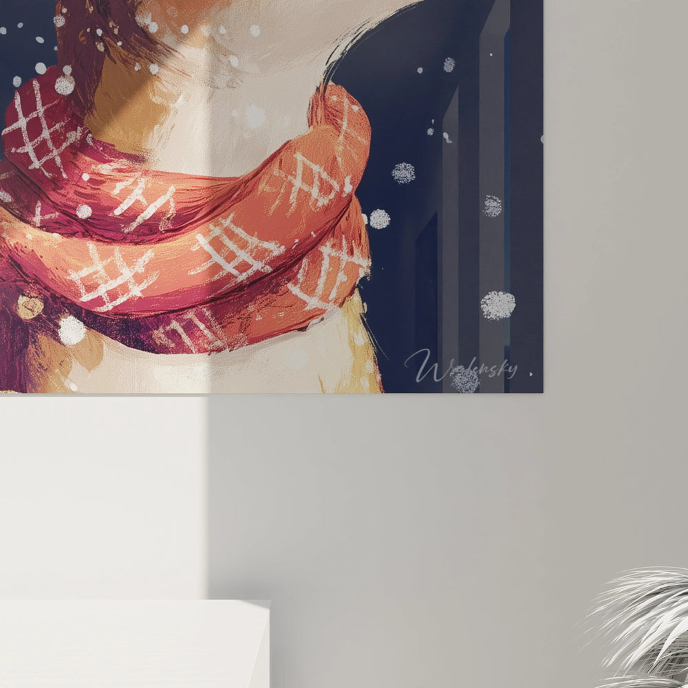 L'originalité de cette œuvre réside dans sa capacité à humaniser l'animal sauvage tout en préservant sa noblesse naturelle. Le détail de l'écharpe rouge transforme ce tableau cerf accessoire mode en une œuvre touchante qui évoque la protection et la bienveillance. Les bois ornés de végétation et de baies constituent un élément distinctif rare, créant une couronne naturelle d'une richesse exceptionnelle. L'expression douce et mélancolique de l'animal, captée dans son regard sombre et profond, établit une connexion émotionnelle immédiate avec l'observateur. Cette décoration murale cerf expressif se distingue par son approche poétique de la faune hivernale, évitant le pittoresque pour atteindre une véritable émotion artistique. La signature discrète dans l'angle inférieur droit atteste de l'authenticité de cette création originale.