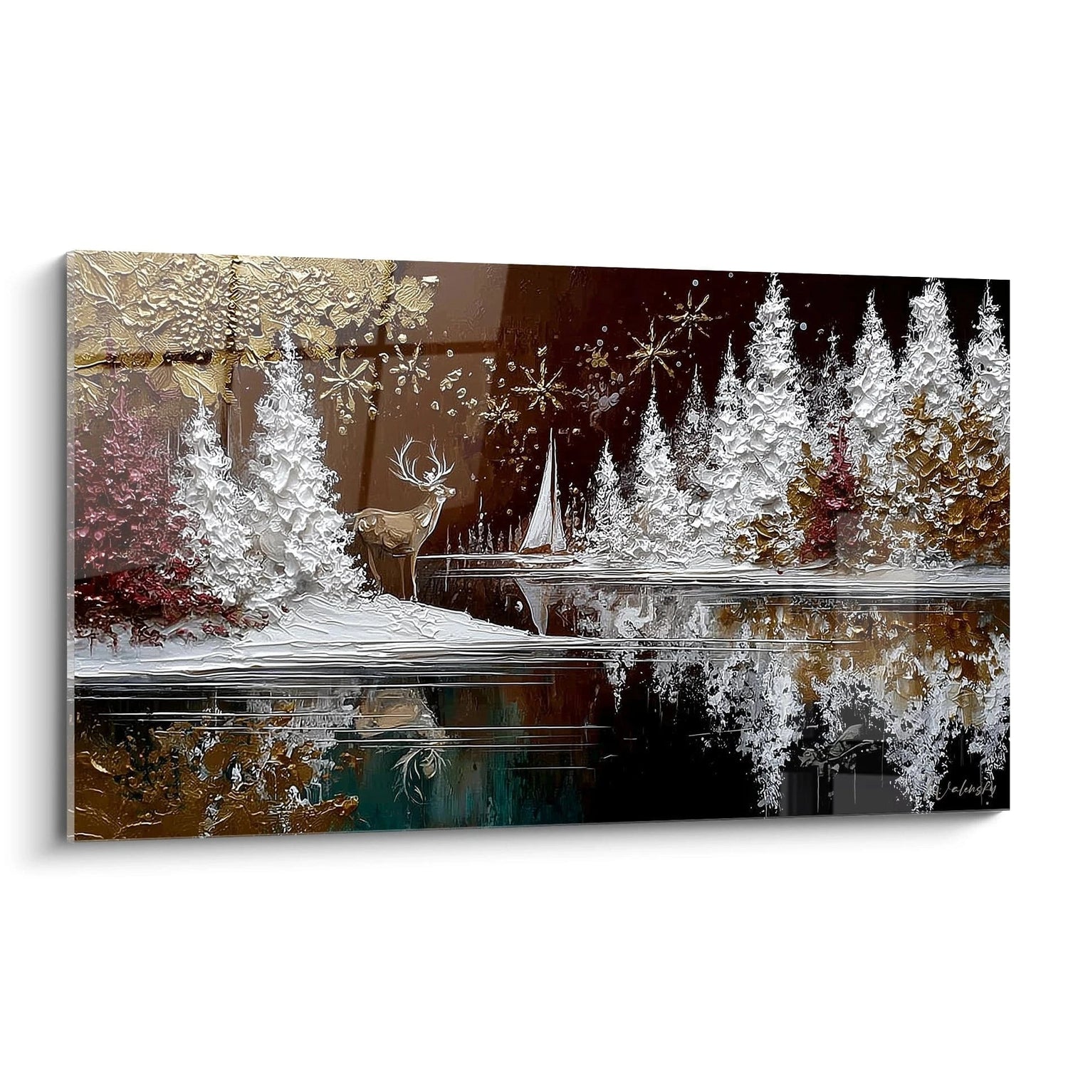 L'unicité de cette œuvre réside dans sa capacité à capturer un instant suspendu entre réalité et féerie. Le cerf, figé dans une pose noble et contemplative, semble être le gardien silencieux de cette forêt enchantée où la nature revêt ses plus beaux atours hivernaux. Cette décoration murale cerf mystique se distingue par l'harmonie parfaite entre tous ses éléments : la danse des flocons, la sérénité de l'eau, la majesté des sapins enneigés. L'effet de profondeur créé par les multiples plans successifs donne une dimension quasi cinématographique à ce tableau cerf scène poétique, invitant le spectateur à pénétrer littéralement dans cet univers onirique.