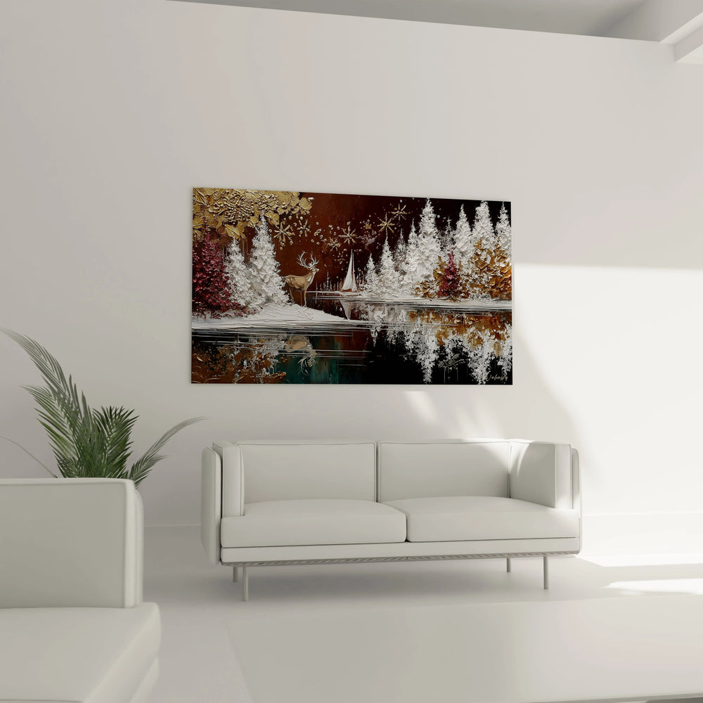 Cette œuvre d'art présente un majestueux cerf au centre d'un paysage hivernal féerique, créant un tableau cerf forêt enchantée d'une beauté saisissante. L'animal se dresse fièrement sur une étendue de neige immaculée, ses bois imposants se détachant contre un arrière-plan de sapins enneigés. La composition révèle un tableau cerf neige scintillante où chaque flocon semble danser dans l'air cristallin. Le reflet parfait de la scène dans l'eau calme du premier plan double la magie visuelle, transformant cette décoration murale cerf en une invitation au voyage dans un monde hivernal sublimé.