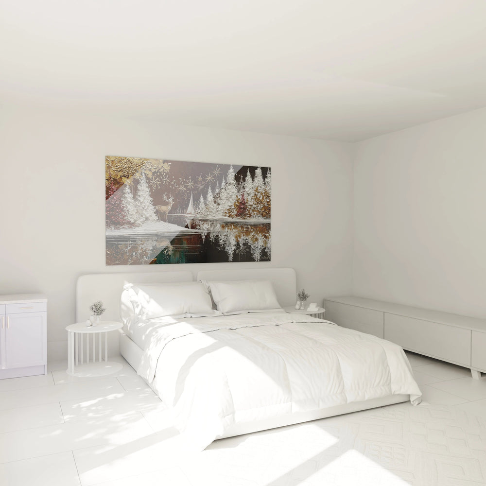 Cette œuvre d'exception trouve naturellement sa place dans un intérieur où dominent les tons neutres et chaleureux qui complètent harmonieusement sa palette dorée. Un éclairage doux et indirect valorise particulièrement les effets de texture et les jeux de lumière sur la neige, créant une ambiance feutrée propice à la contemplation. Cette décoration murale cerf s'épanouit magnifiquement dans un salon aux murs beiges ou gris perle, où elle peut déployer toute sa magie visuelle sans concurrence chromatique. L'association avec des matières naturelles comme le bois clair ou la pierre apporte une cohérence stylistique qui sublime davantage ce tableau cerf décor raffiné.