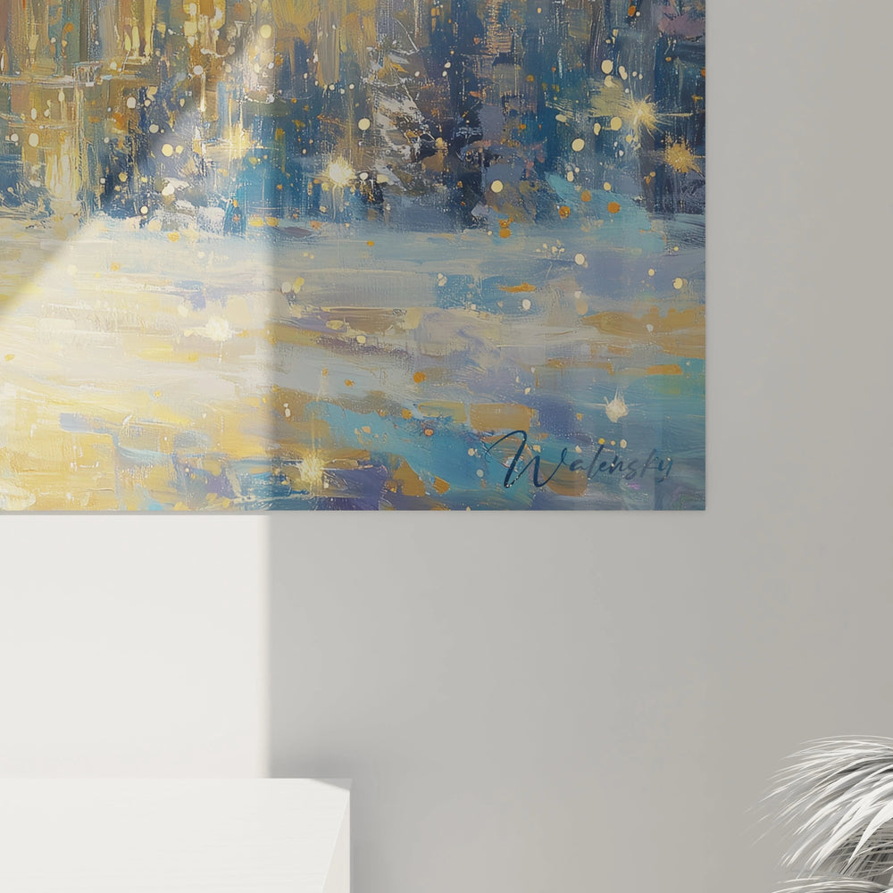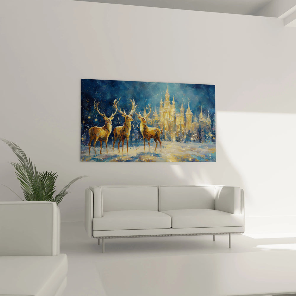 Cette œuvre captivante présente trois cerfs majestueux aux bois dorés, se détachant contre un ciel nocturne parsemé d'étoiles scintillantes. Le tableau cerfs château magique révèle immédiatement une atmosphère féerique, où la neige tombante crée une ambiance hivernale envoûtante. Au second plan, un château aux tours élancées baigne dans une lumière dorée mystérieuse, conférant à cette décoration murale cerfs une dimension conte de fées. Les flocons de neige, représentés par des points lumineux dorés et blancs, dansent dans l'air, créant un mouvement perpétuel qui anime l'ensemble de la composition.