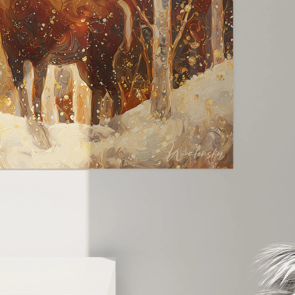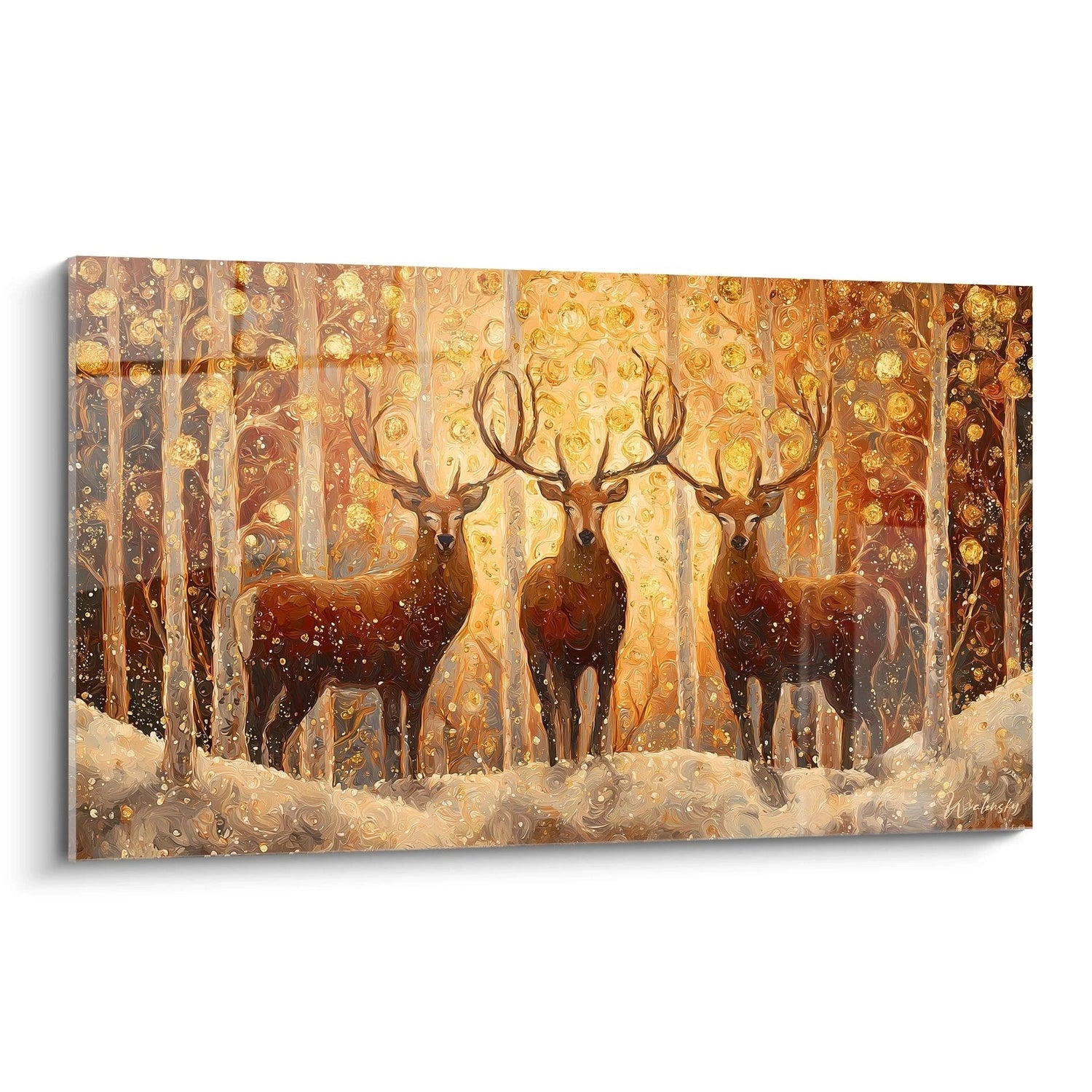 La palette chromatique de ce tableau cerfs se compose principalement de nuances chaudes dorées contrastant avec des bruns profonds. Les tons ocre et ambre dominent l'arrière-plan, créant une atmosphère chaleureuse malgré le contexte hivernal. Le tableau cerfs ambiance dorée joue sur l'opposition entre les teintes sombres du pelage des animaux et la luminosité éclatante du paysage. Les touches de blanc pur de la neige apportent des points de repos visuel. Cette harmonie chromatique génère une sensation de coucher de soleil perpétuel, où la lumière semble émaner de l'intérieur même de la toile.