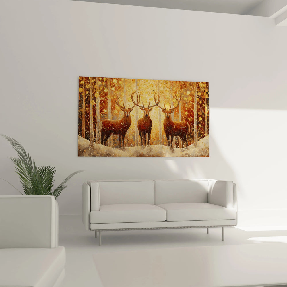 La composition de ce tableau cerfs s'organise selon une géométrie parfaitement équilibrée. Les trois cerfs occupent le centre de l'œuvre, positionnés en ligne légèrement décalée qui guide naturellement le regard de gauche à droite. Les troncs d'arbres verticaux encadrent la scène et renforcent la profondeur perspective. Le tableau cerfs forêt enneigée utilise l'espace négatif de la neige pour mettre en valeur les silhouettes sombres des animaux. Les proportions respectent une harmonie classique où chaque élément trouve sa place sans concurrence visuelle. L'horizon bas permet aux arbres de s'élever majestueusement vers le ciel doré.