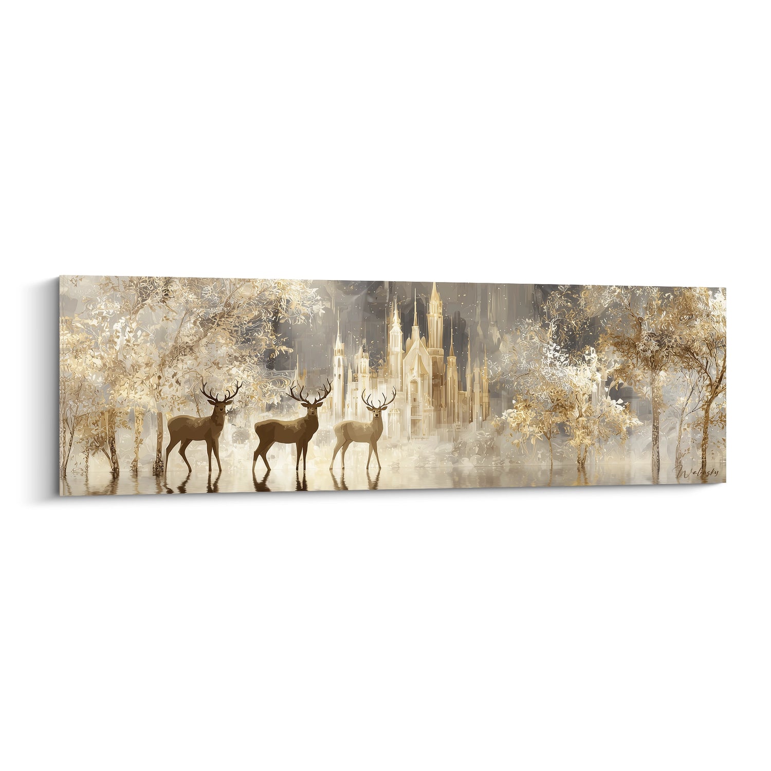 Les textures de cette œuvre cerfs fantaisie révèlent une maîtrise technique remarquable. La surface de l'eau présente un rendu lisse et miroir qui contraste avec la rugosité suggérée de l'écorce des arbres dorés. Les détails des ramures des cerfs sont ciselés avec une précision d'orfèvre, chaque branche se détachant nettement contre la brume lumineuse. L'architecture du château révèle des textures gothiques finement travaillées, avec des jeux d'ombre et de lumière qui donnent du relief aux tours élancées. Cette art mural cerfs détaillé exploite magistralement les contrastes de matières pour créer une profondeur visuelle captivante.