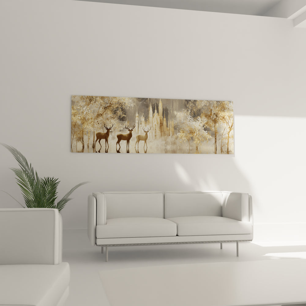 La composition de cette œuvre cerfs architecture obéit à une géométrie parfaitement équilibrée. Les trois cerfs occupent stratégiquement le tiers inférieur de l'œuvre, créant une base stable et majestueuse. Le château gothique se positionne au centre exact de la composition, servant de point focal magnétique. Les arbres dorés encadrent naturellement la scène, formant une arche végétale qui guide le regard vers l'architecture mystérieuse. Cette art mural cerfs château utilise la règle des tiers de manière magistrale, plaçant les éléments principaux aux intersections visuelles les plus impactantes pour créer un équilibre parfait entre terre et ciel.