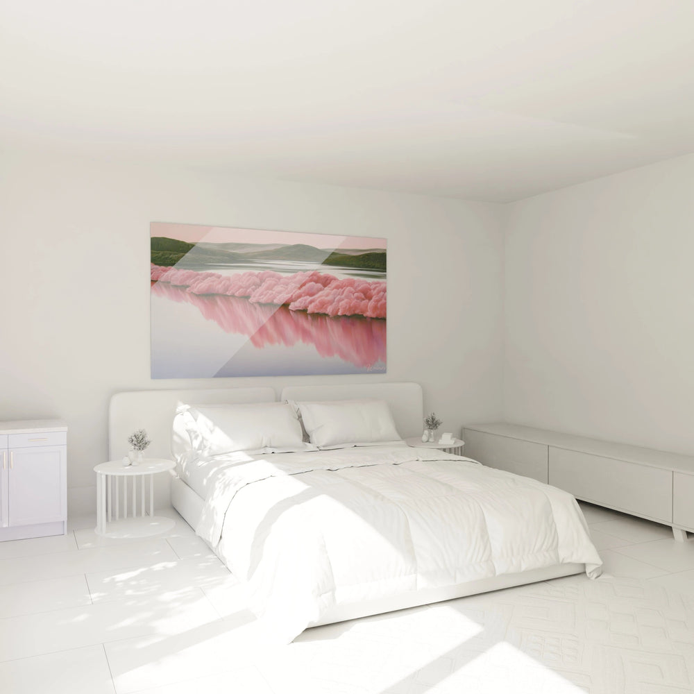 Ce tableau cerisiers révèle une composition d'une beauté saisissante où les cerisiers en fleurs dominent la scène avec leurs nuances roses délicates. Les arbres forment une ligne harmonieuse le long du rivage, créant un tableau cerisiers reflets parfaits dans les eaux calmes du lac. Cette décoration murale cerisiers capture l'essence même de la floraison printanière avec un réalisme troublant. L'œuvre cerisiers présente des détails botaniques d'une précision remarquable, chaque fleur semblant palpiter de vie. La composition équilibrée de ce tableau cerisiers roses évoque instantanément la paix et la contemplation, transformant n'importe quel espace en sanctuaire de sérénité.