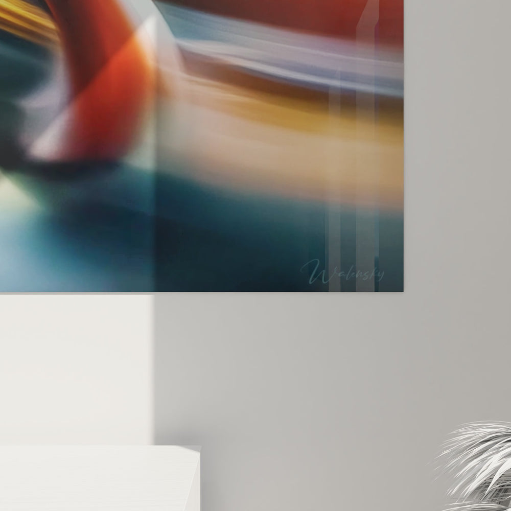 Ce tableau mural chaise moderne capture l'essence du mouvement à travers la technique du light painting. L'œuvre présente une chaise contemporaine aux lignes épurées, sublimée par des traînées lumineuses qui créent un effet de dynamisme saisissant. Les couleurs vives se mélangent harmonieusement : le bleu profond contraste avec des teintes orangées et dorées, créant une composition équilibrée. Cette décoration murale moderne transforme un objet du quotidien en véritable œuvre d'art contemporain. La technique du light painting permet de révéler la beauté cachée du mobilier design, offrant une perspective unique sur l'esthétique industrielle. Ce tableau design contemporain s'intègre parfaitement dans un intérieur moderne, apportant une touche d'originalité et de sophistication. L'effet de flou artistique et les jeux de lumière créent une atmosphère mystérieuse qui invite à la contemplation. Cette art mural light painting témoigne de l'innovation artistique contemporaine, où la photographie rencontre l'art plastique pour créer des œuvres uniques.