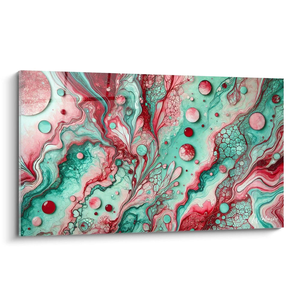 Imaginez les teintes profondes du rouge rubis fusionnant avec des touches de vert émeraude et des éclats d’or rose. Cette combinaison rare donne vie à un spectacle visuel fascinant, où les formes fluides s’entrelacent comme dans un ballet naturel. Le contraste dynamique entre la chaleur passionnée et la fraîcheur apaisante invite votre regard à s’y perdre, créant une atmosphère à la fois stimulante et réconfortante chez vous.