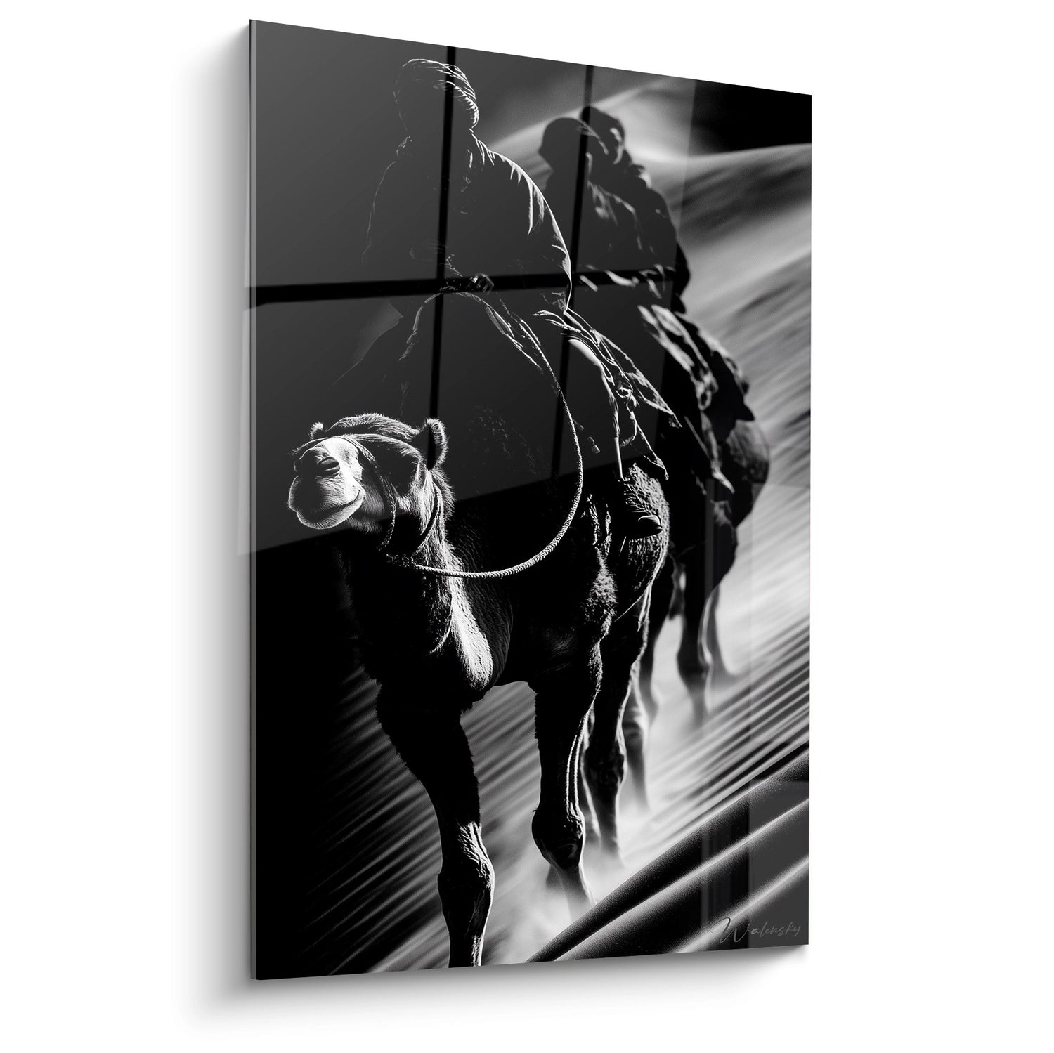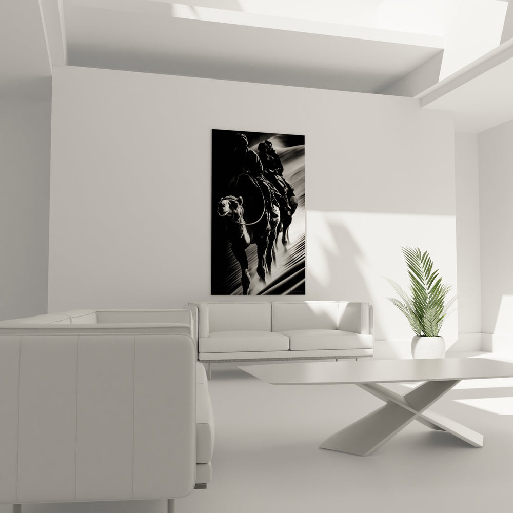 La palette monochrome de ce tableau art désert renforce la dimension intemporelle de la scène. Le noir et blanc évoque la permanence des traditions nomades face aux défis du désert. Cette décoration salon orientale symbolise la persévérance, l'adaptation et l'harmonie entre l'homme et la nature hostile, créant une atmosphère méditative et apaisante.