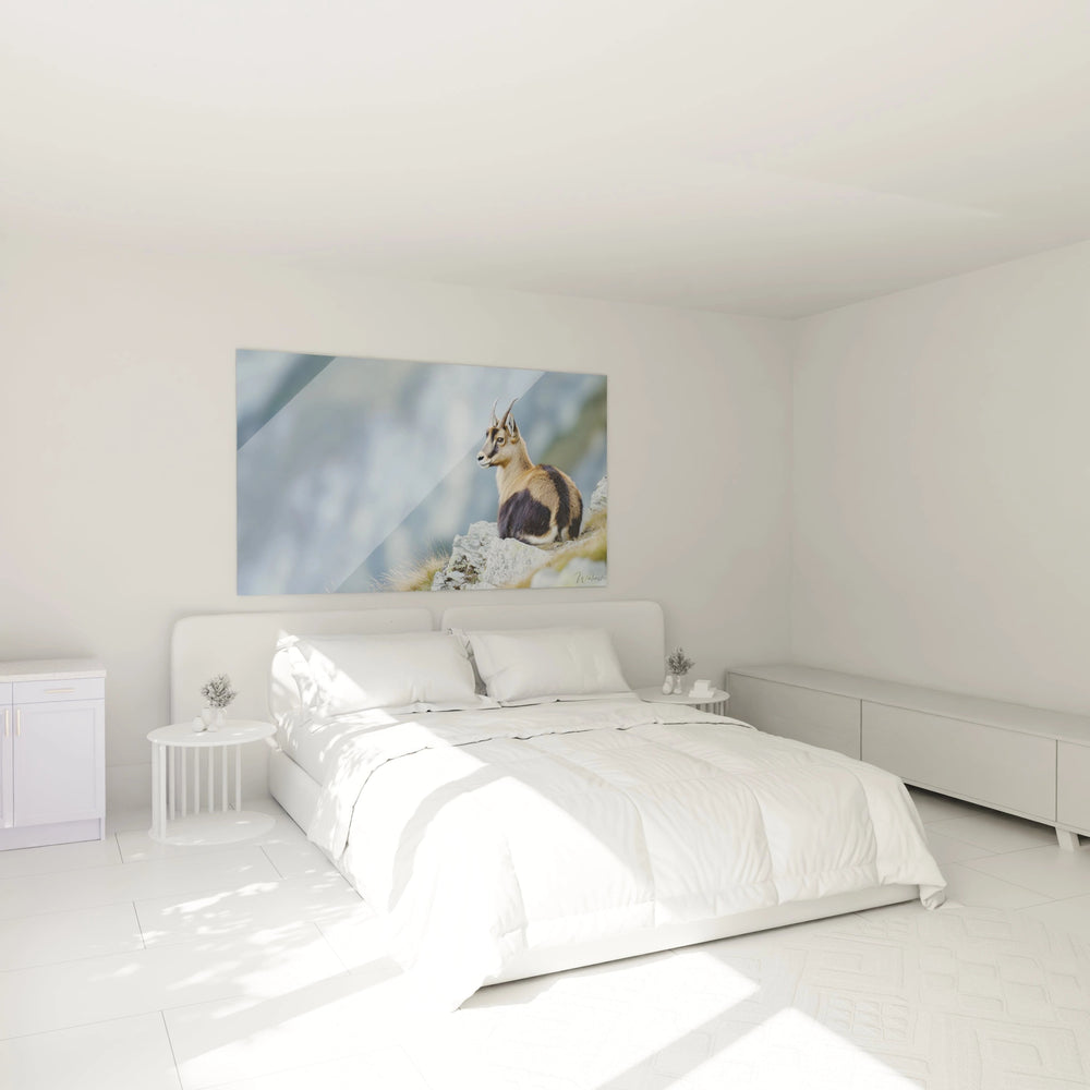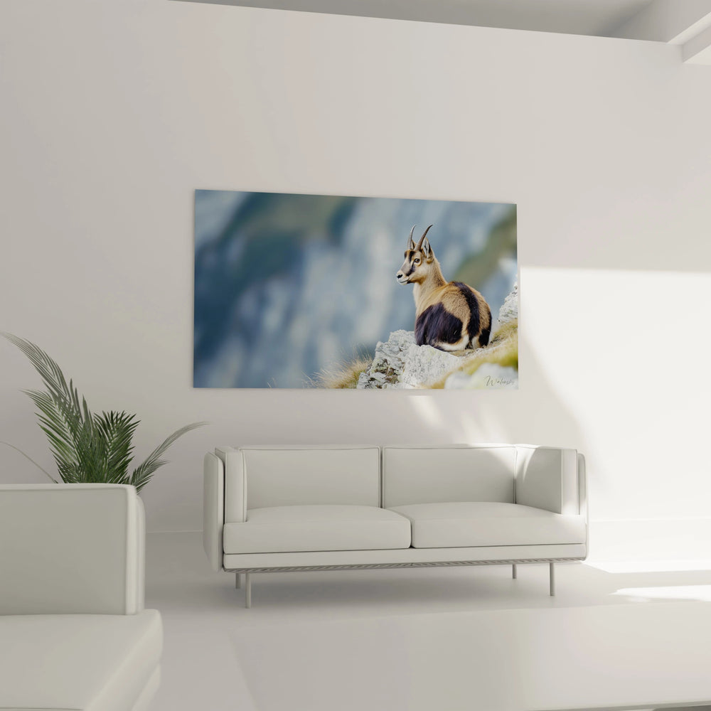 Le cadrage spécifique, qui place le chamois sur son promontoire rocheux face à l'immensité, crée une narration visuelle puissante évoquant la liberté et la solitude majestueuse des créatures alpines. Cette décoration murale chamois ne se contente pas de représenter un animal, elle raconte l'histoire d'une existence adaptée aux conditions extrêmes des hauteurs.