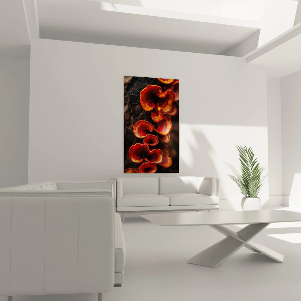 En contemplant ce tableau, vous ressentirez la fraîcheur d’un sous-bois humide, le doux parfum terreux des feuilles en décomposition, et le murmure feutré du forestier au réveil. Les courbes sensuelles des champignons se détachent en contraste sur un fond chaleureux, baigné d’une lumière tamisée qui caresse chaque texture. Ces nuances automnales de rouge, orange et marron créent une atmosphère enveloppante où la nature se révèle dans toute sa richesse et sa complexité.