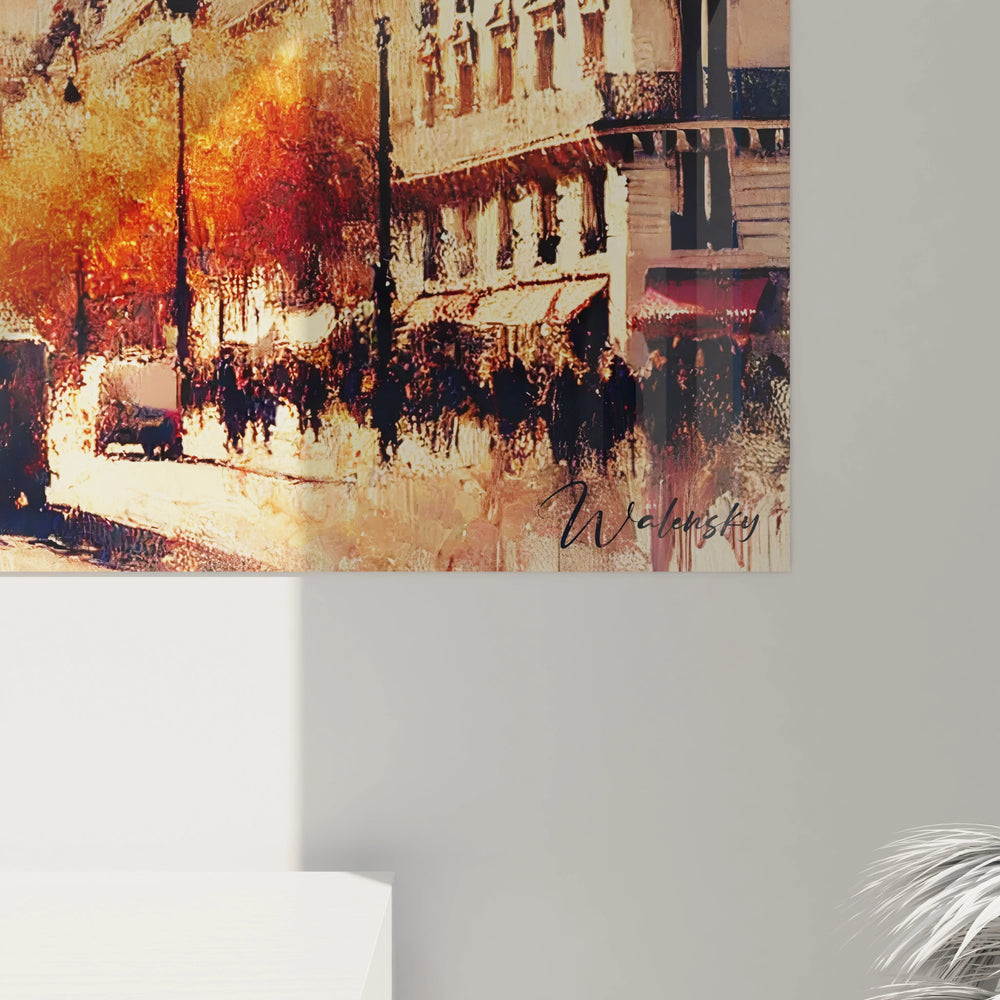 Les couleurs chaudes, oscillant entre rose orangé et beige lumineux, enveloppent la scène d’une douce chaleur, évoquant la sérénité d’un soir d’automne. Vous ressentez presque les premiers frissons d’air frais, le bruissement subtil des passants, et le reflet chatoyant des lampadaires sur les pavés. Ce tableau ne se contente pas de décorer votre intérieur : il y installe une atmosphère raffinée où chaque regard découvre un fragment d’histoire et de poésie urbaine.