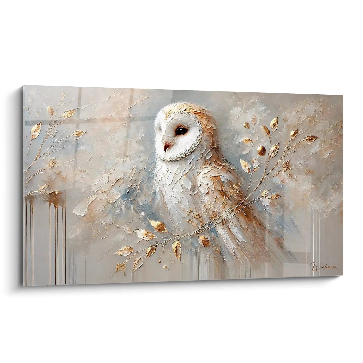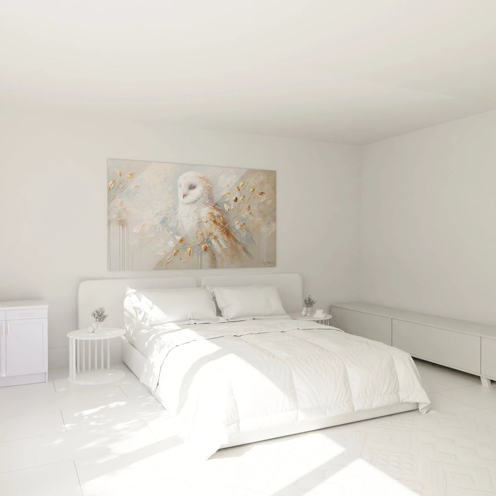 Ce tableau capture avec raffinement l’essence même de la chouette, symbole universel de sagesse et d’intuition. Sa représentation subtile, nichée parmi des branches dorées et des feuillages délicats, vous transporte dans un univers où le temps ralentit, où chaque détail respire la poésie et la tranquillité. La texture profonde et presque palpable du plumage se mêle à un fond vaporeux, créant un équilibre parfait entre présence tangible et atmosphère éthérée.